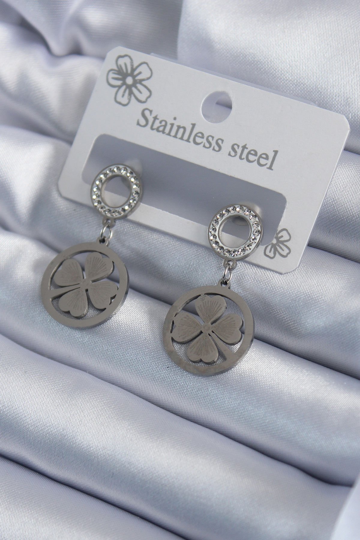 316L Çelik Gümüş Renk Zirkon Taşlı Yonca Model İşleme Detay Kadın Küpe