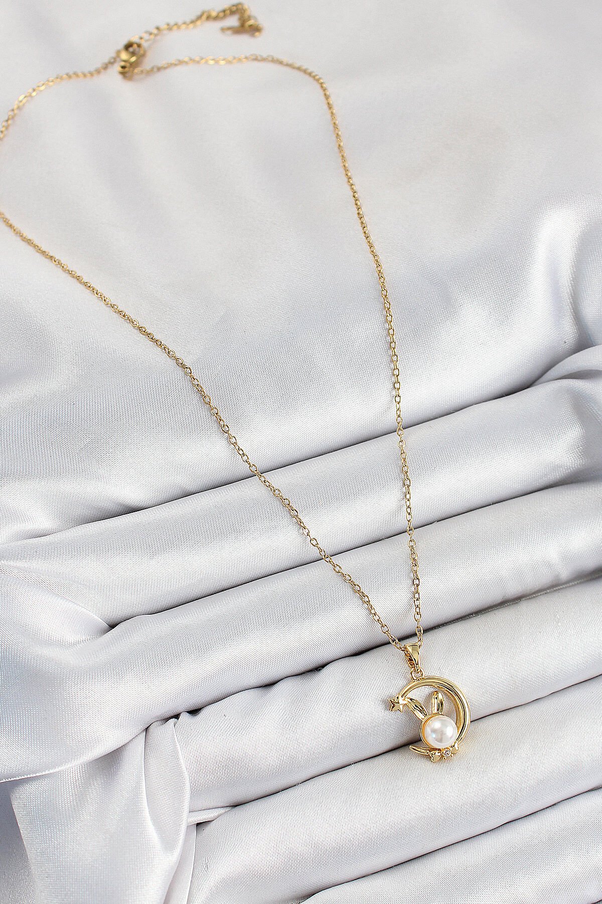 316L Çelik İnci Detaylı Hilal Tavşan Model Gold Renk Kadın Kolye