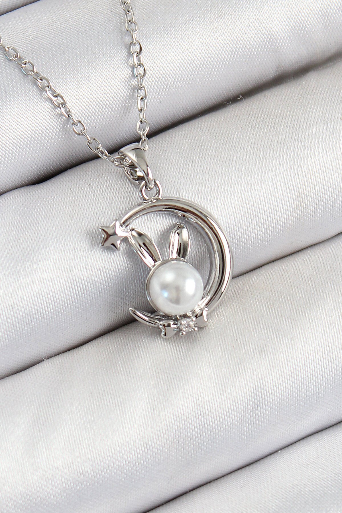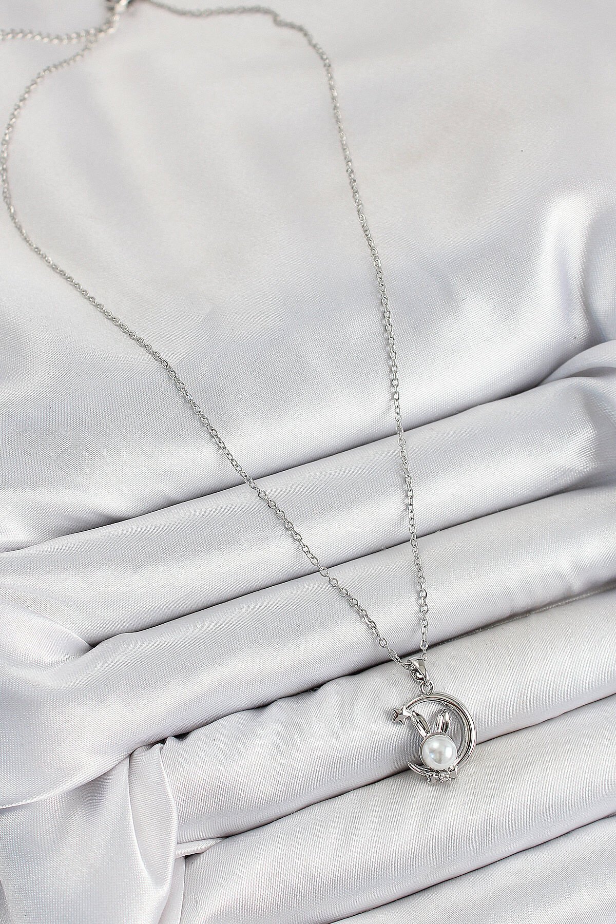 316L Çelik İnci Detaylı Hilal Tavşan Model Gümüş Renk Kadın Kolye