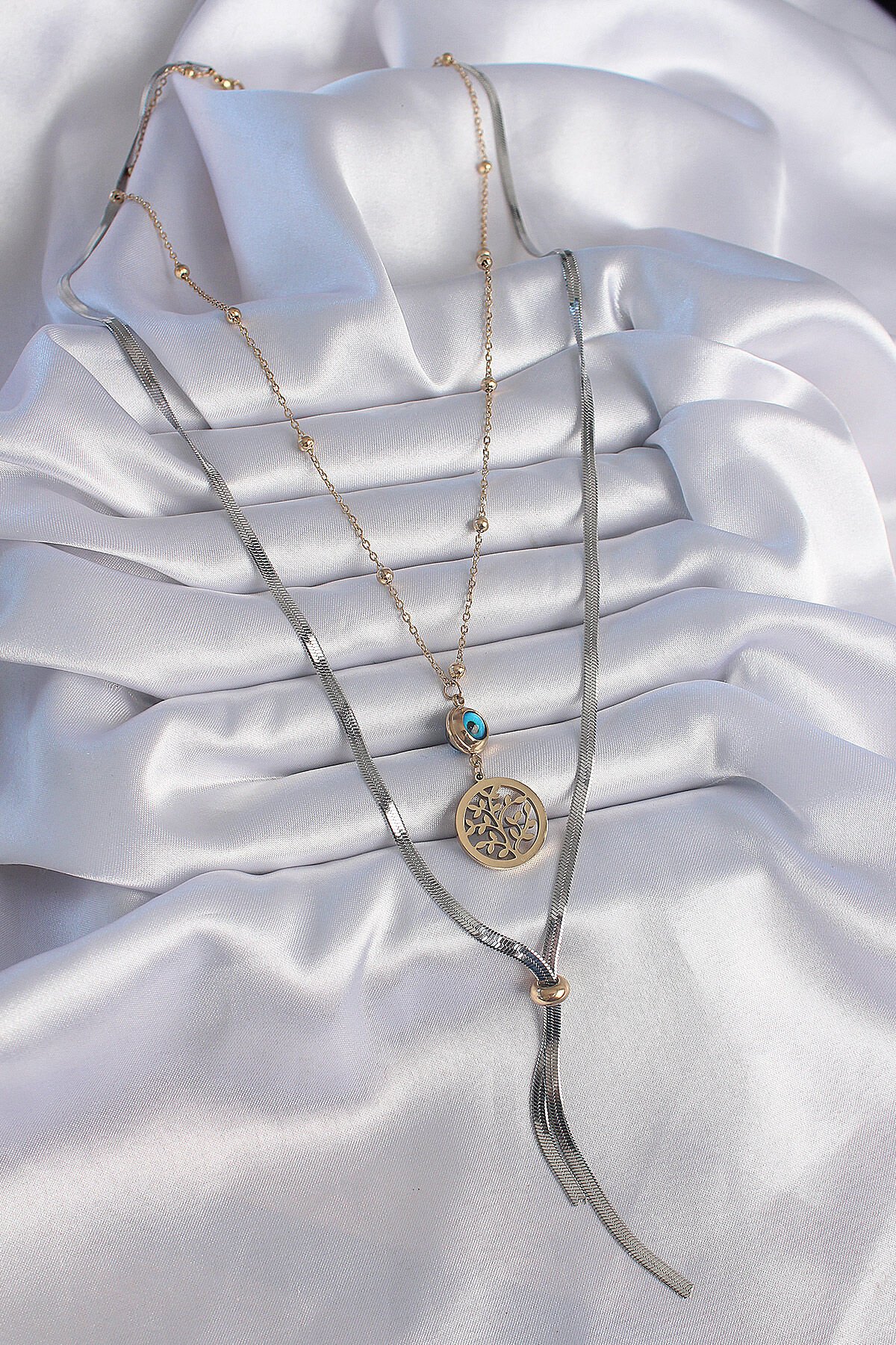 316L Çelik Mix Renk Filiz Figür Nazar Boncuk Detay Uzun Kadın Kolye