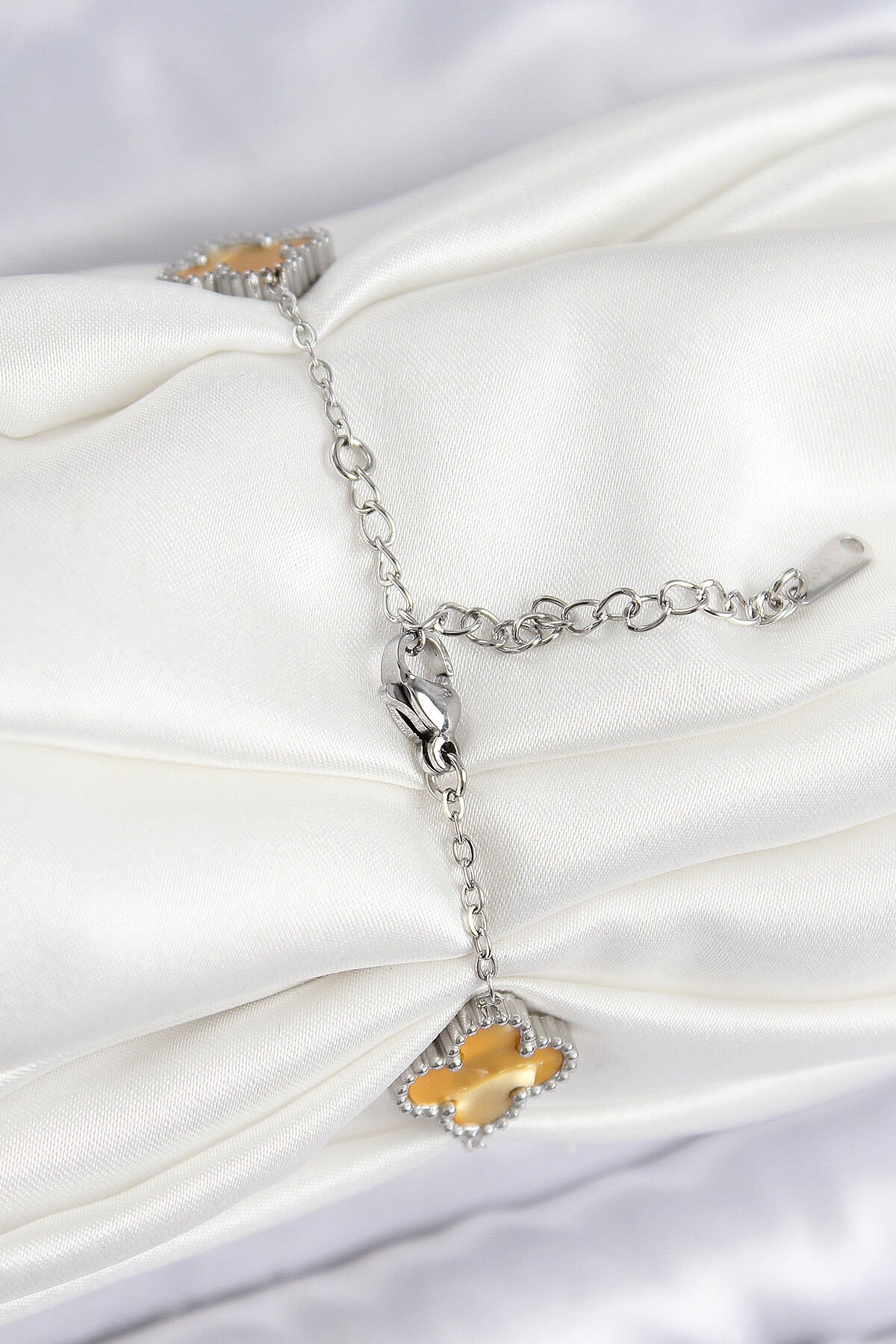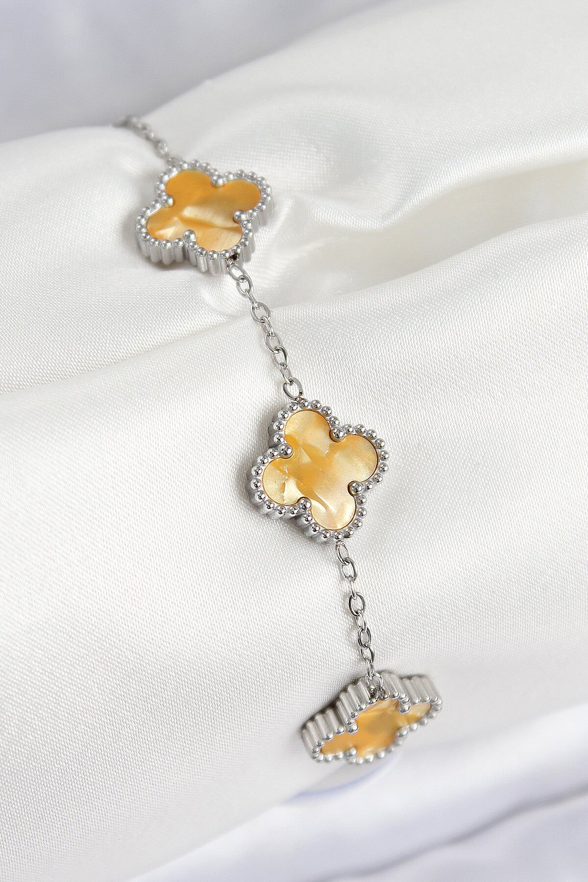 316L Çelik Sedefli Kehribar Sarı Gümüş Renk Yonca Kadın Bileklik