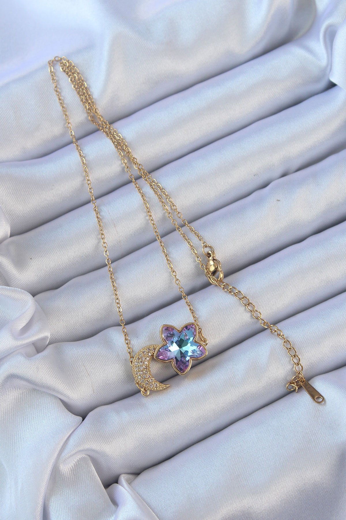 316L Çelik Zincir Altın Renk Ay Tasarımlı Renkli Zirkon Taşlı Çiçek Kolye