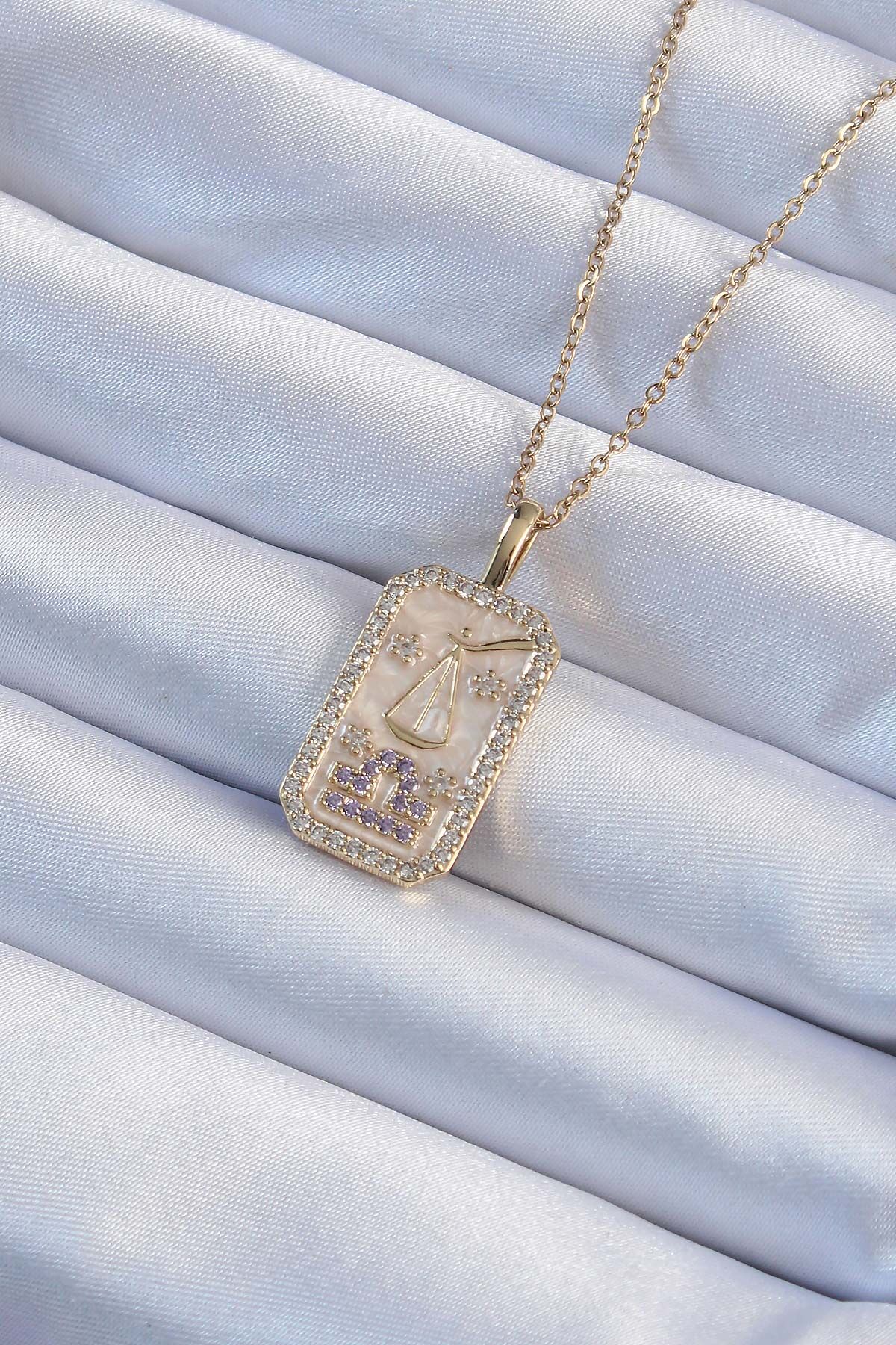 316L Çelik Zincir Altın Renk Lila Zirkon Taşlı Tarot Kolye e_BKO9239