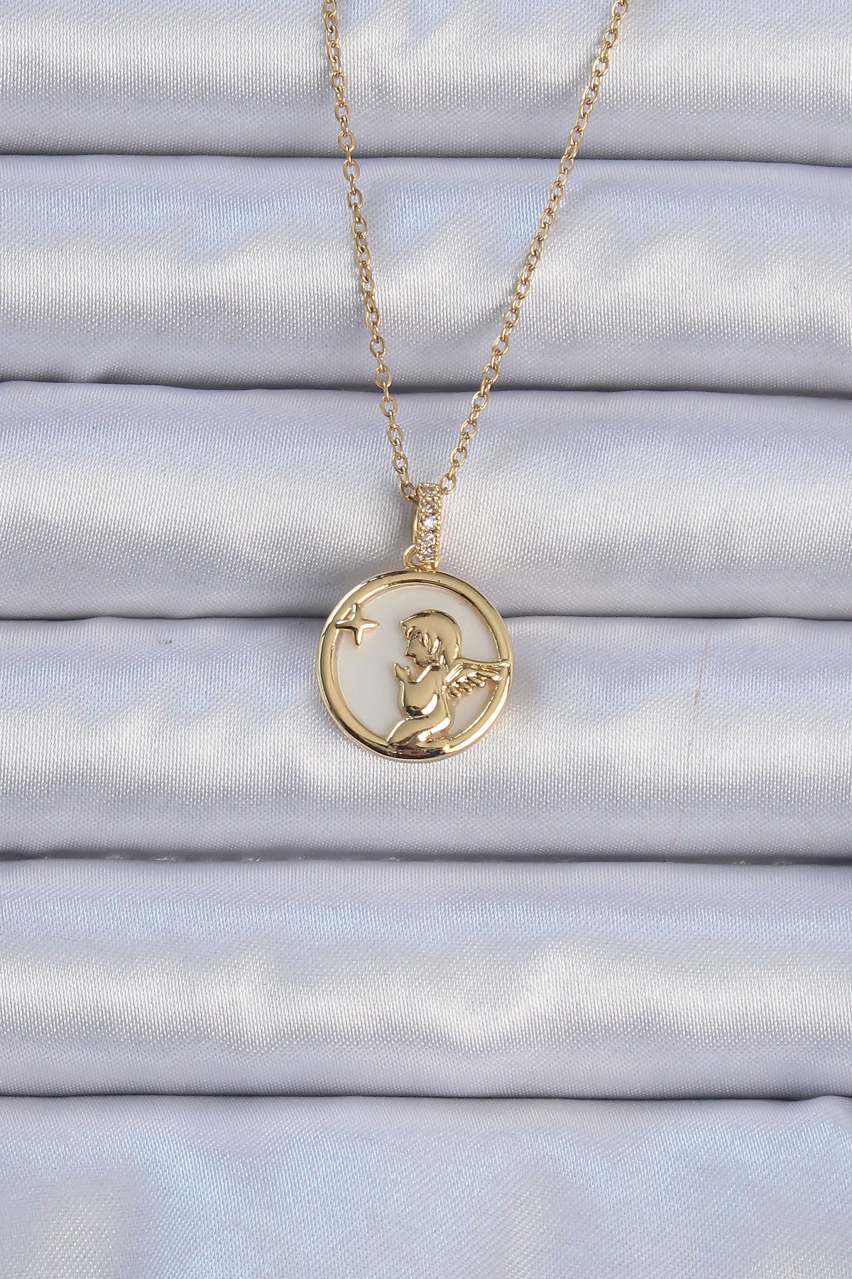 316L Çelik Zincir Altın Renk Zirkon Taşlı Mineli Melek Kolye e_BKO9085