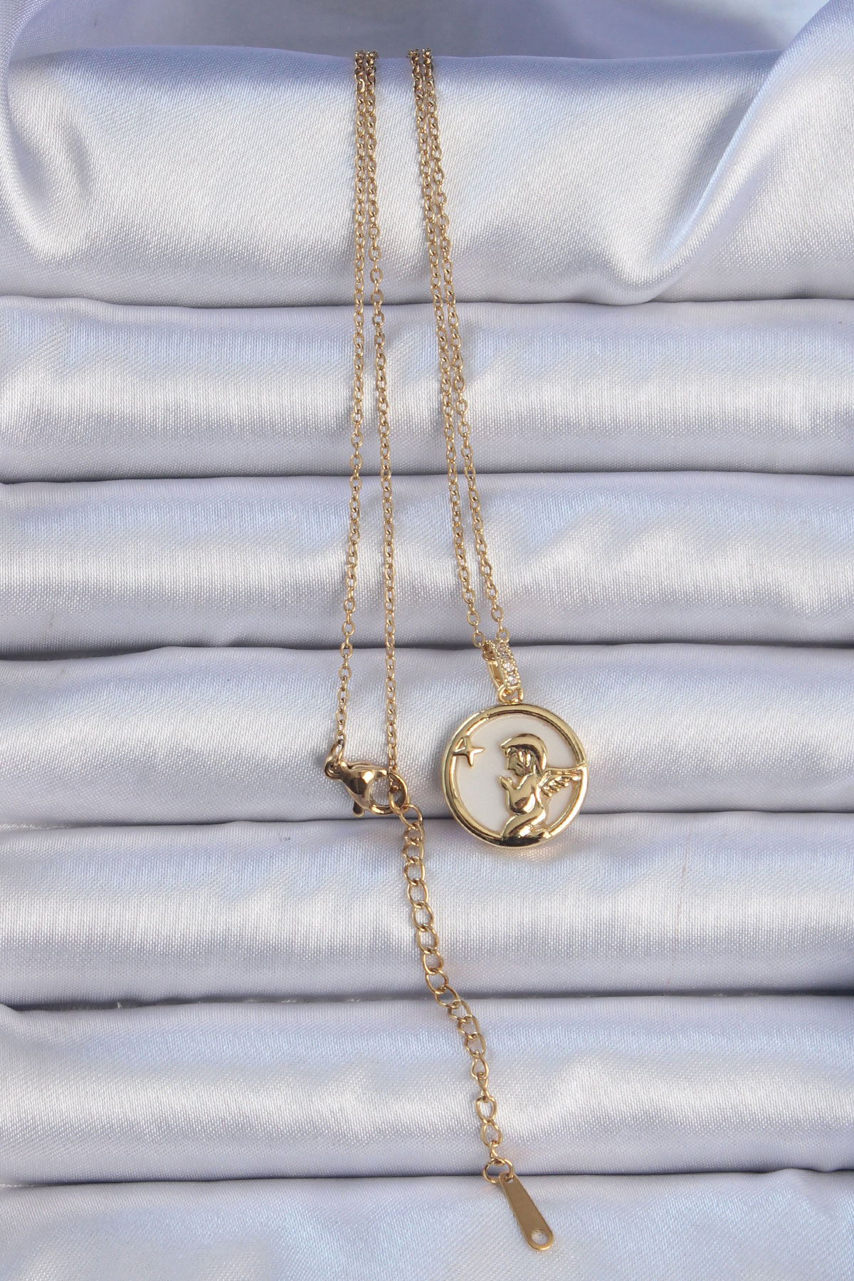 316L Çelik Zincir Altın Renk Zirkon Taşlı Mineli Melek Kolye