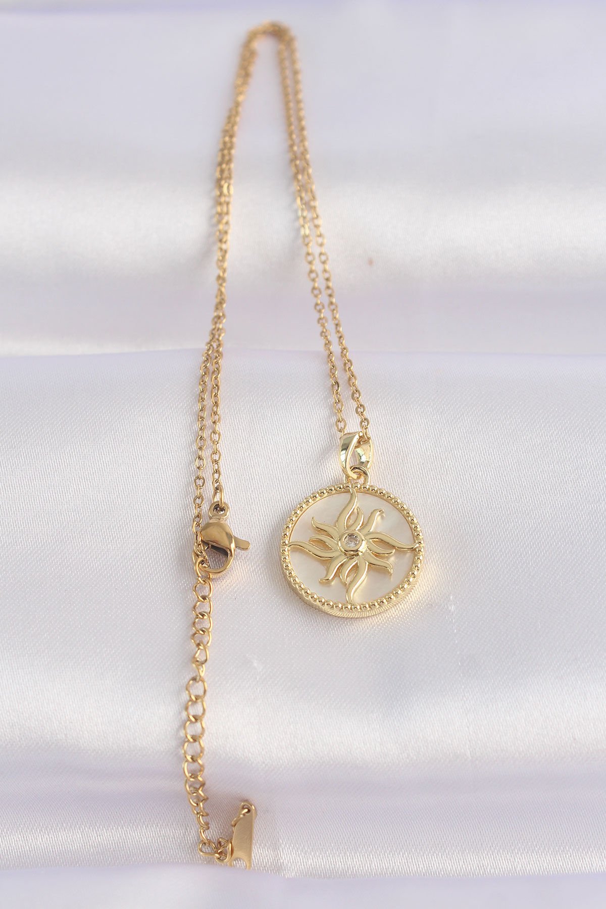 316L Çelik Zincir Altın Renk Zirkon Taşlı Oval Tasarım Güneş Kolye