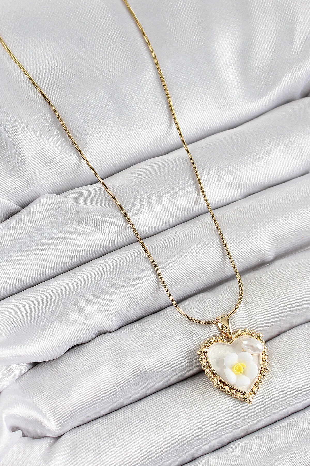 316L Çelik Zincir Beyaz Sanatsal Portre İnci Detaylı Papatya Figürlü Kalp Model Gold Renk Kadın Kolye