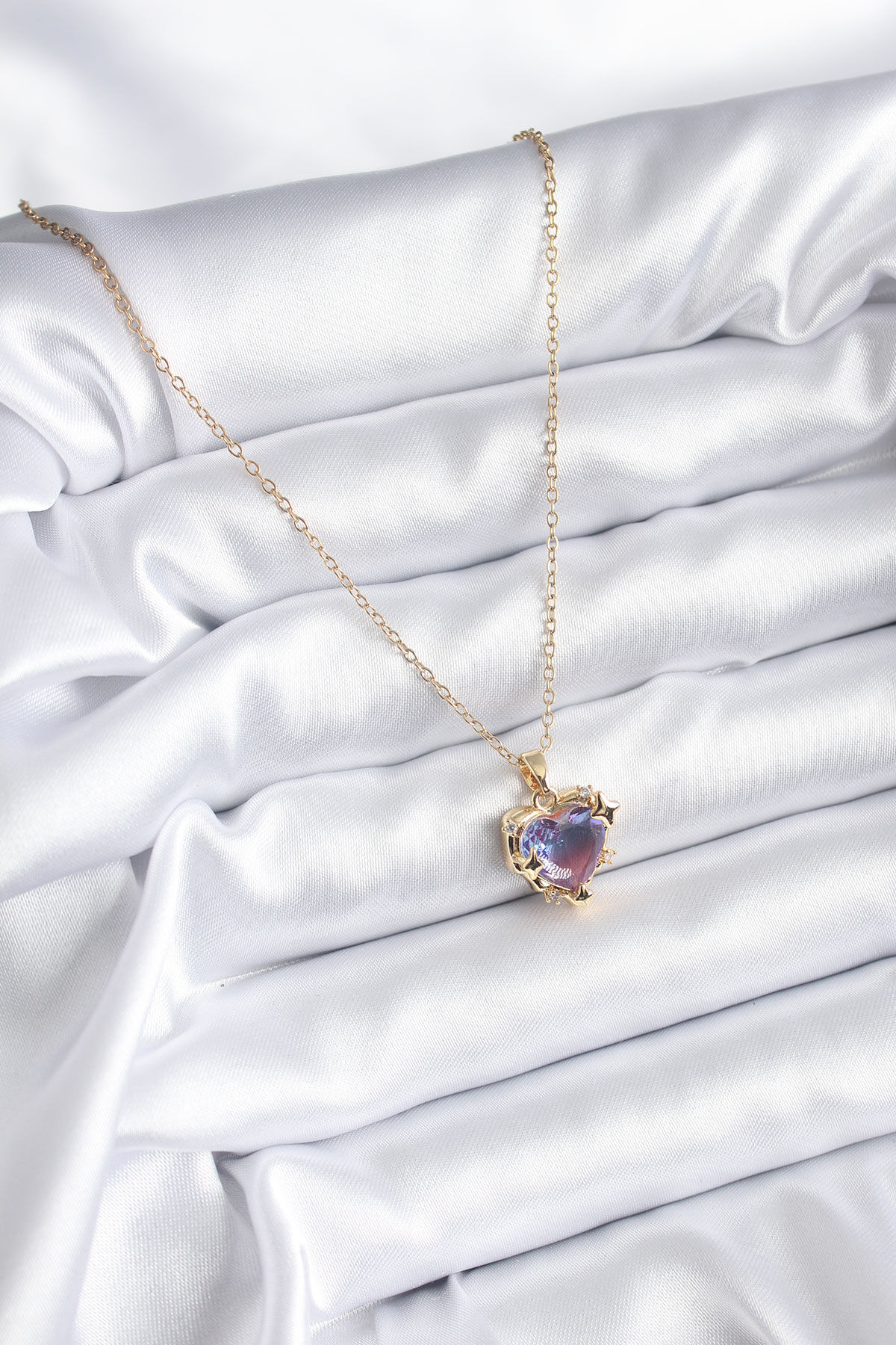 316L Çelik Zincir Gold Renk Mor Renk Zirkon Taşlı Kalp Model Kadın Kolye