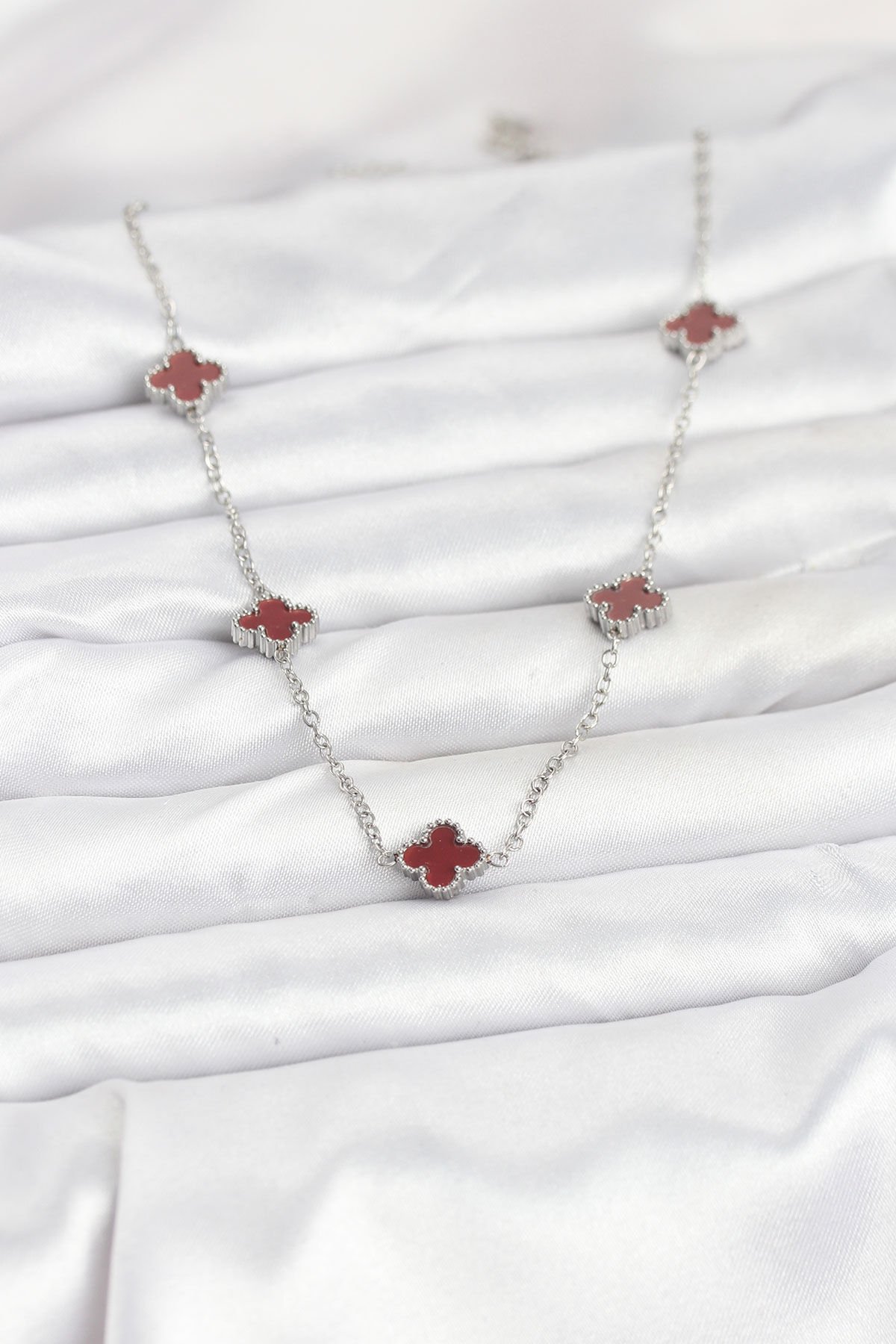 316L Çelik Zincir Gümüş Renk Bordo Baby Boy Yonca Kadın Kolye e_BKO10577