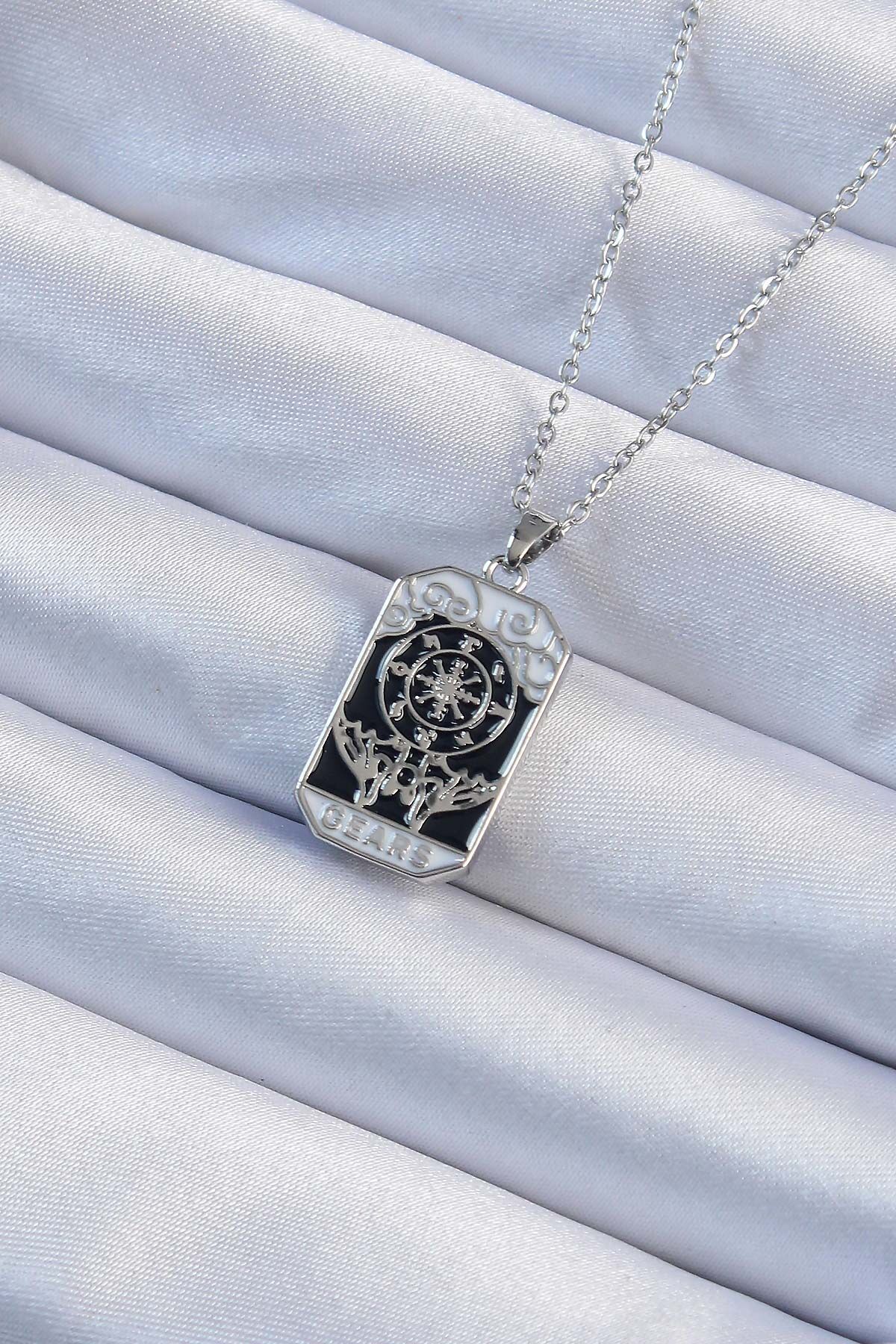 316L Çelik Zincir Gümüş Renk İşlemeli Siyah Mineli Tarot Kolye