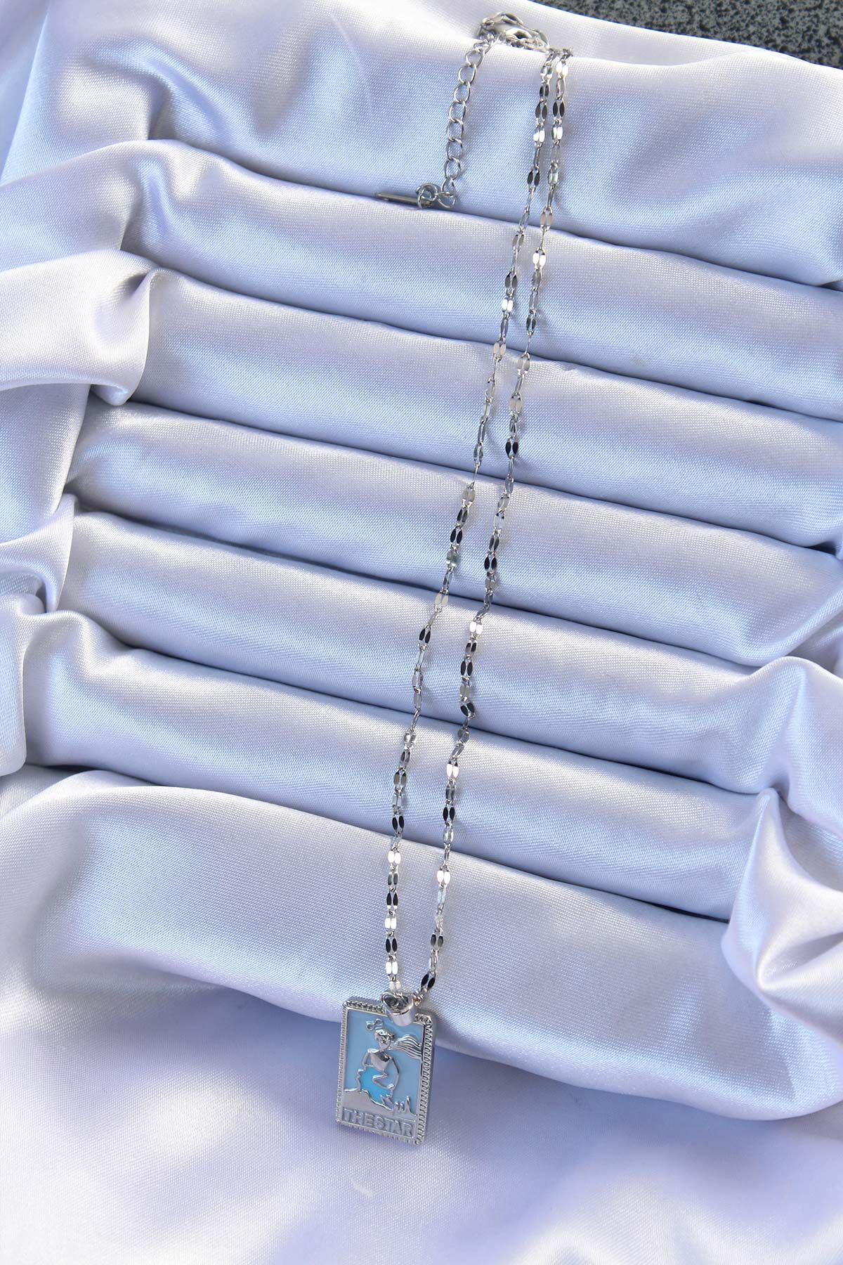 316L Çelik Zincir Gümüş Renk Mavi Mineli Tarot Kolye e_BKO9210