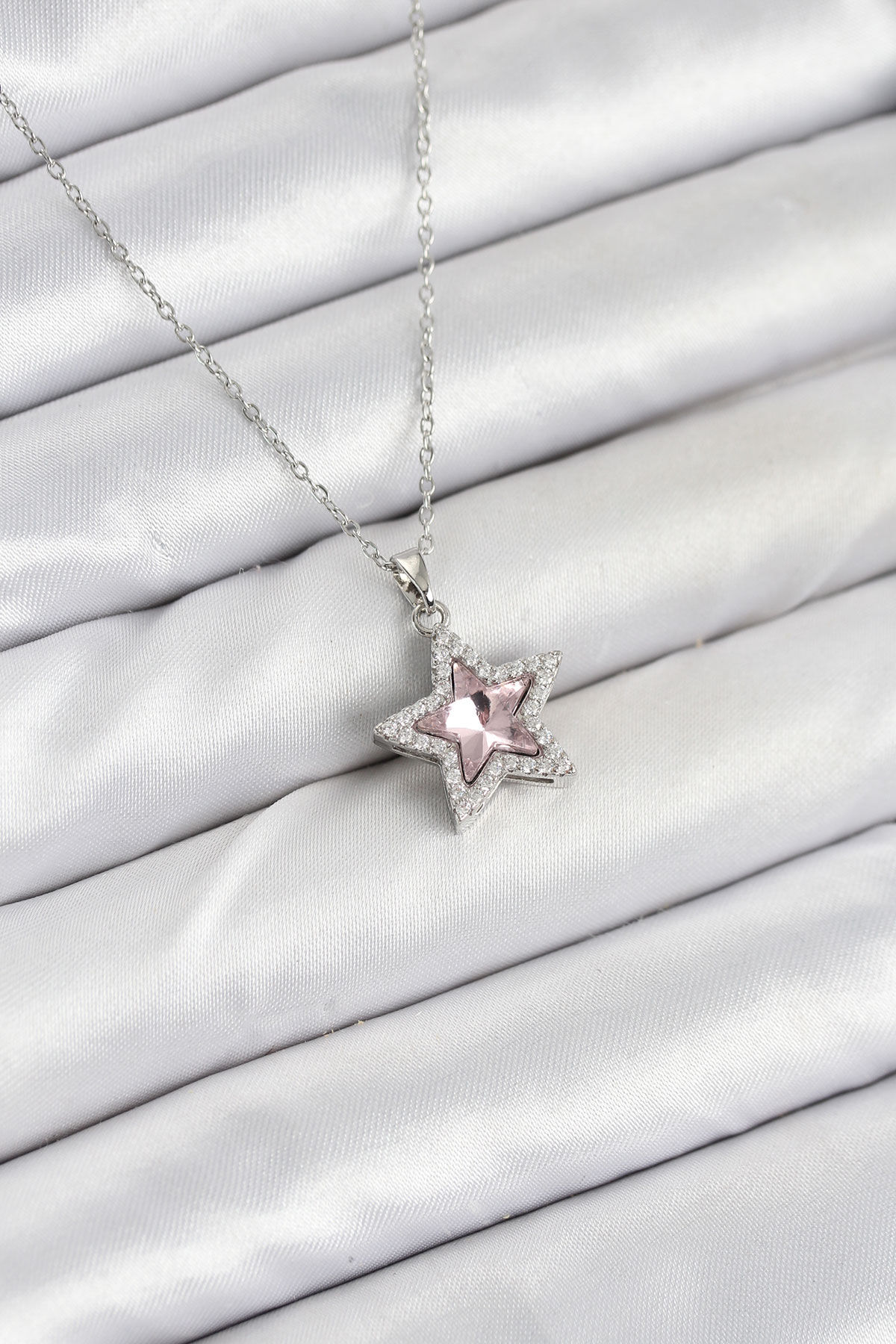 316L Çelik Zincir Gümüş Renk Pembe Taşlı Yıldız Model Kadın Kolye e_BKO10620