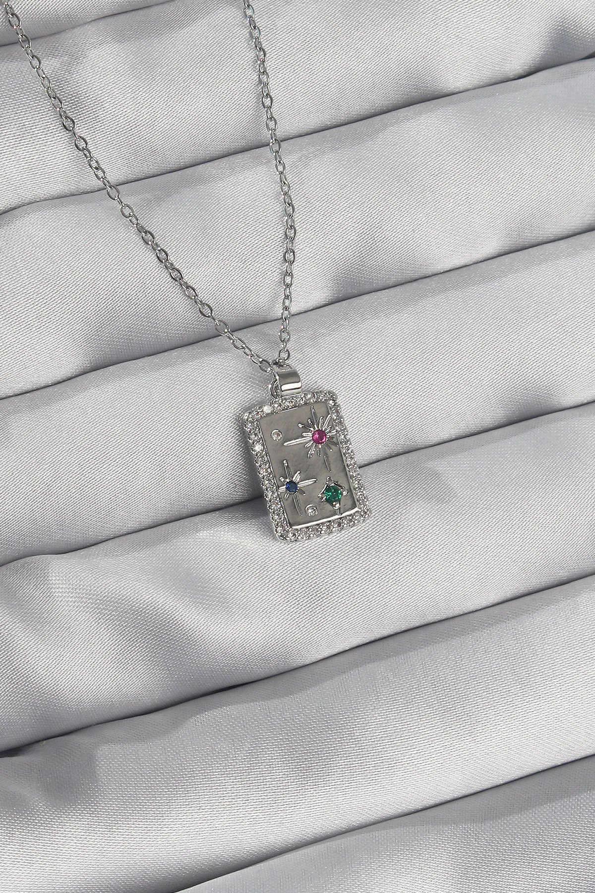 316L Çelik Zincir Gümüş Renk Renkli Zirkon Taşlı Vintage Kolye e_BKO8910