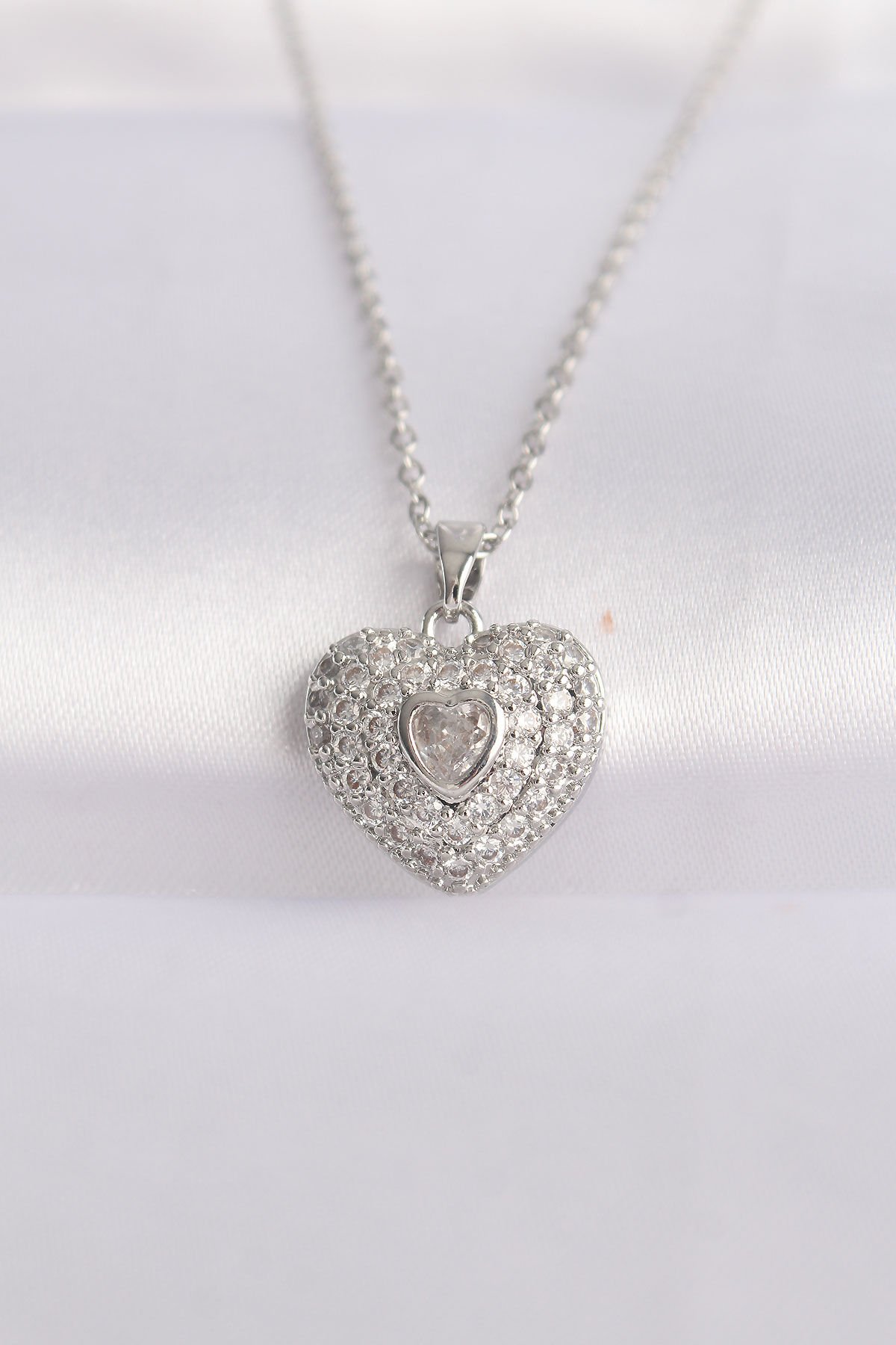 316L Çelik Zincir Gümüş Renk Zirkon Taşlı Kalp Kolye