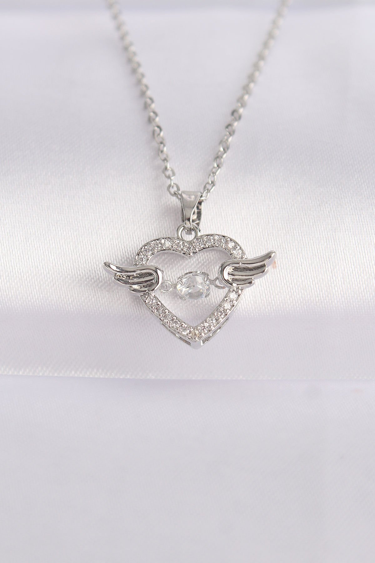 316L Çelik Zincir Gümüş Renk Zirkon Taşlı Kanatlı Kalp Kolye