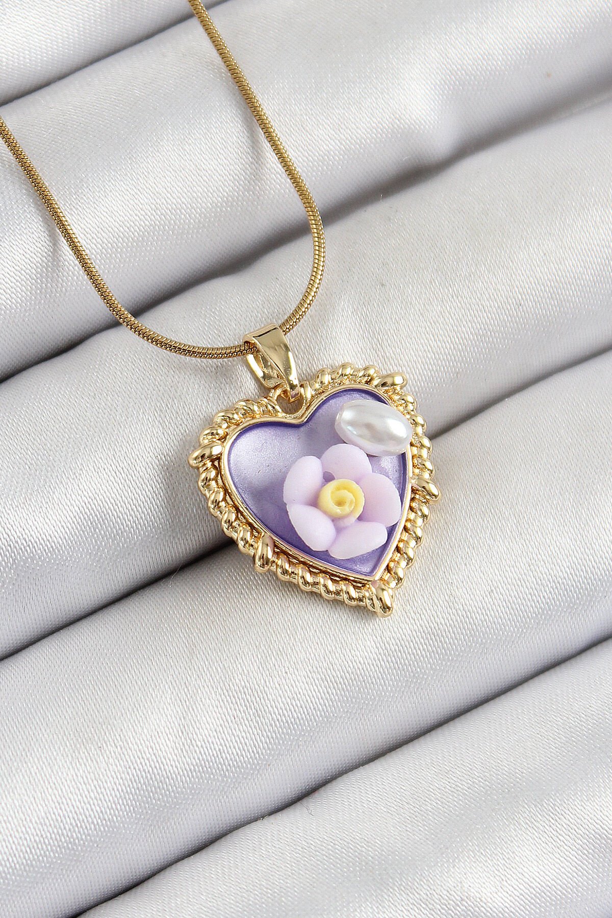 316L Çelik Zincir Mor Sanatsal Portre İnci Detaylı Papatya Figürlü Kalp Model Gold Renk Kadın Kolye