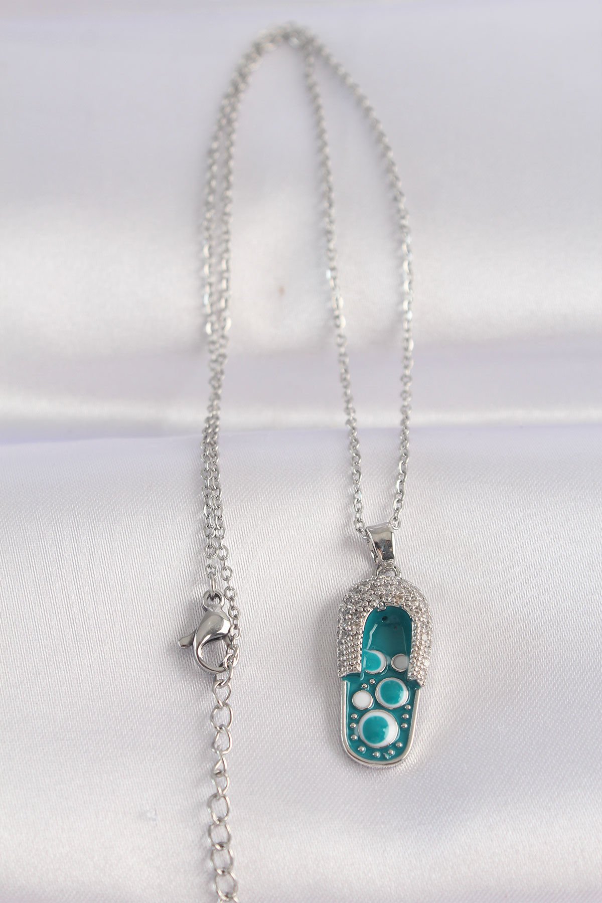 316L Çelik Zincir Zirkon Taşlı Gümüş Renk Nazarlı Terlik Tasarımlı Kolye