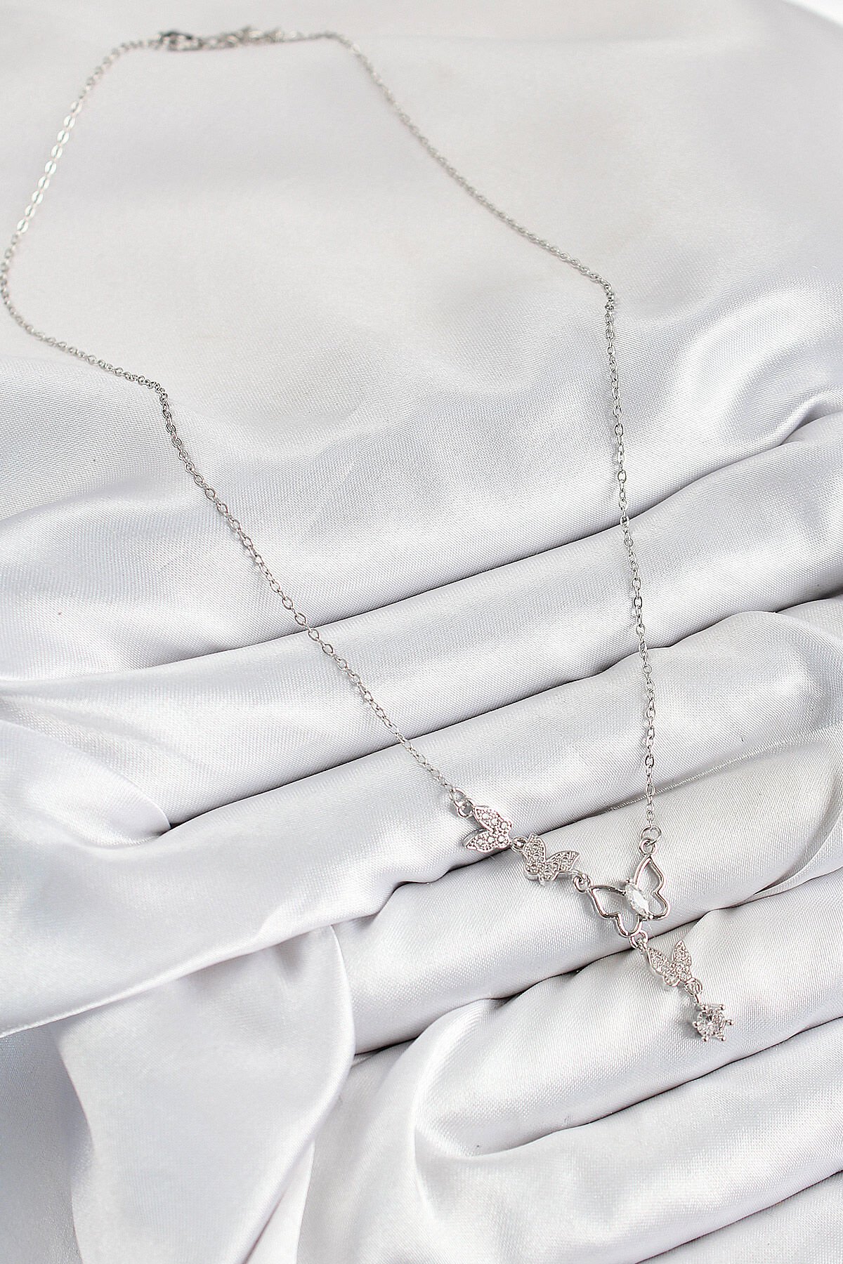 316L Çelik Zirkon Taşlı Kelebek Model Gümüş Renk Kadın Kolye e_BKO10404
