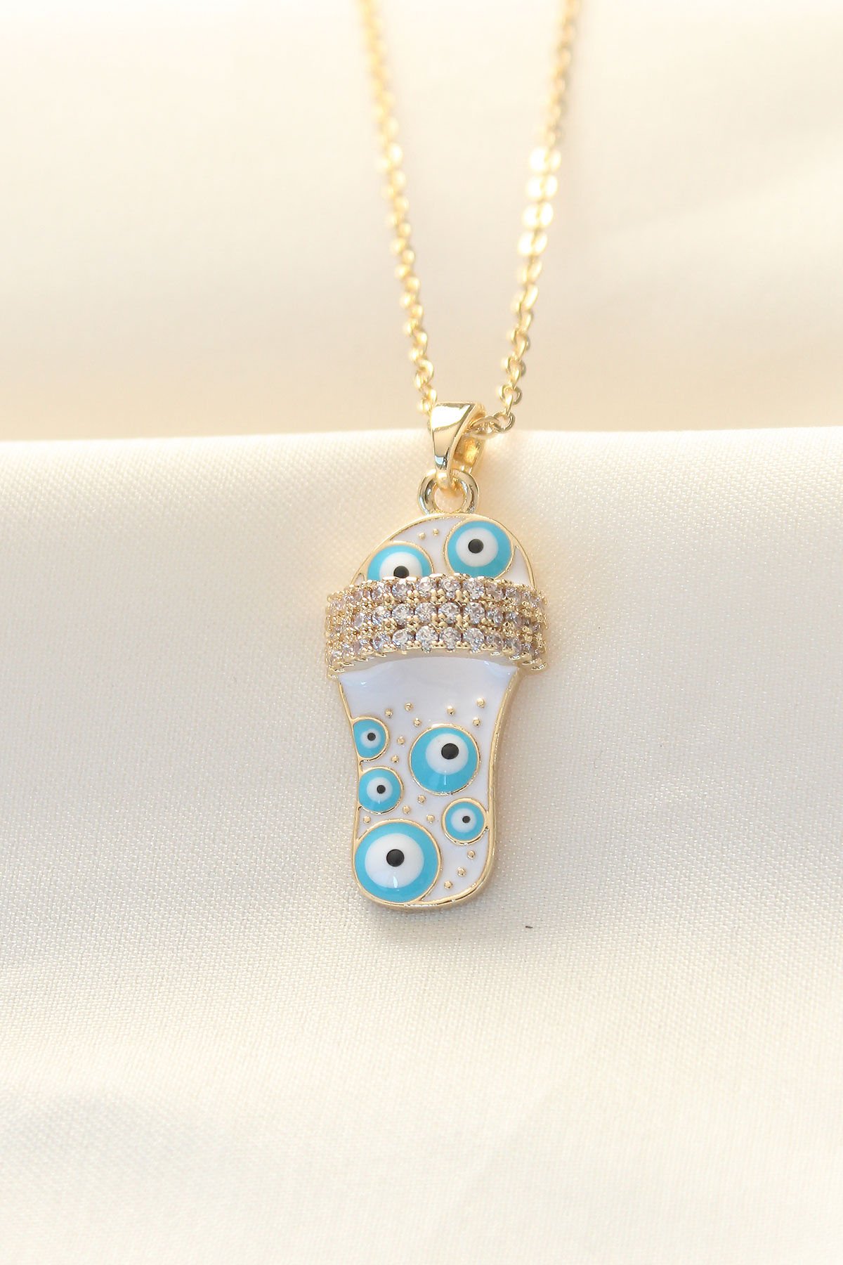 316L Zinciri Çelik Zirkon Taşlı Gold Renk Nazar Boncuklu Terlik Kolye