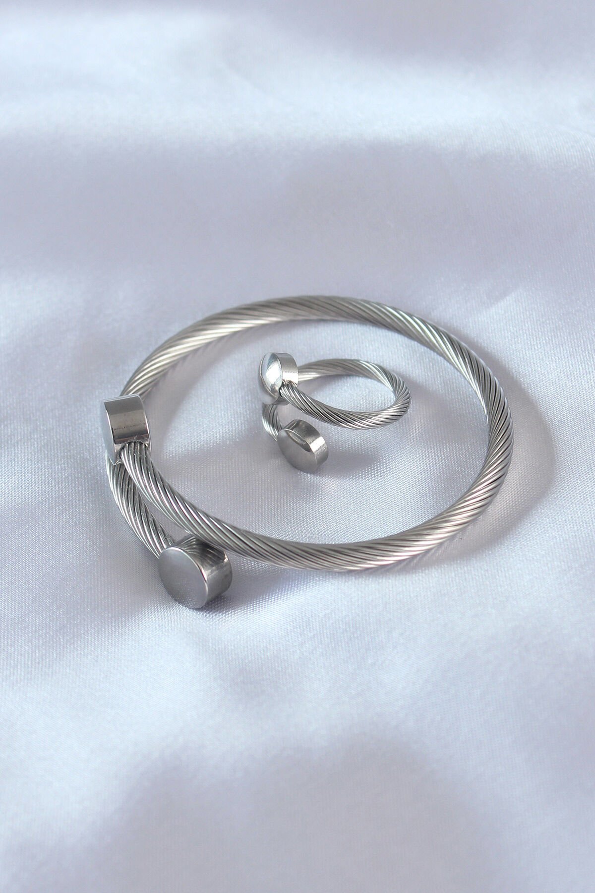 Çelik Gümüş Renk Sıkı Burgu Model Erkek Bileklik Yüzük Seti
