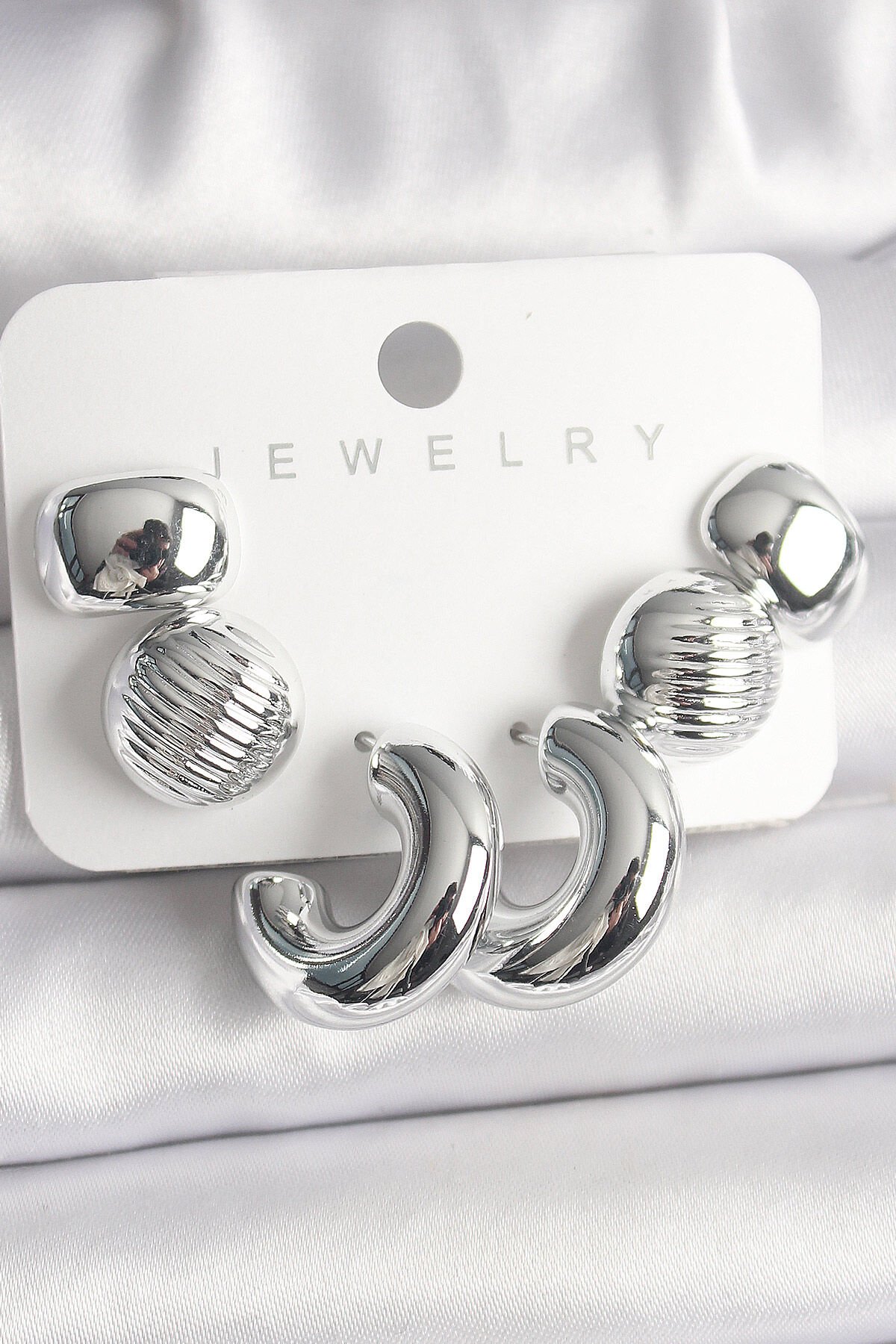 Gümüş Renk İşlemeli Daire Halka Model CCB Platik Kadın Küpe Seti e_BKP10025