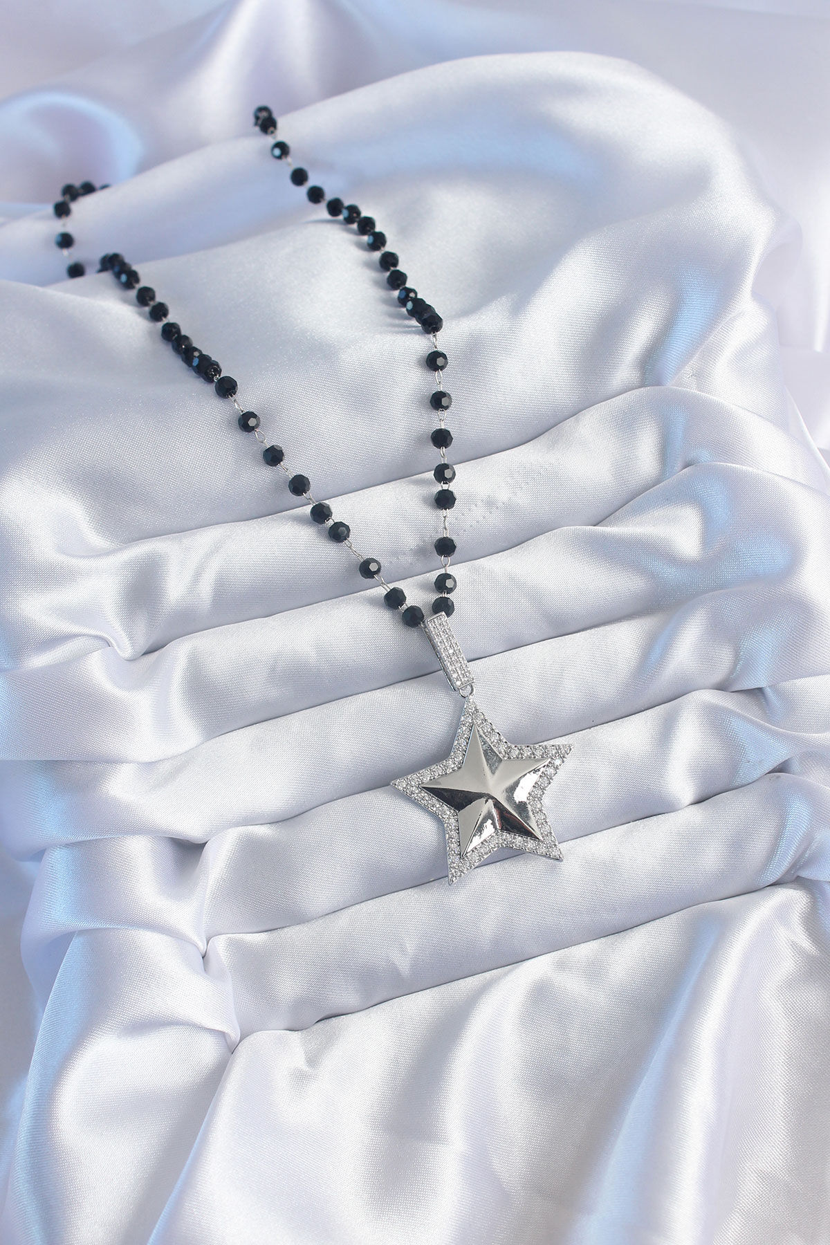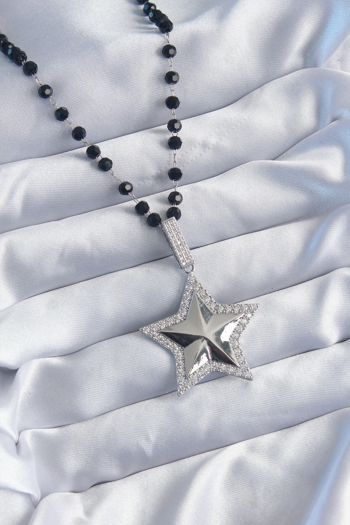 Gümüş Renk Siyah Boncuk Zirkon Taşlı Pirinç Yıldız Model VİP Seri Kadın Kolye