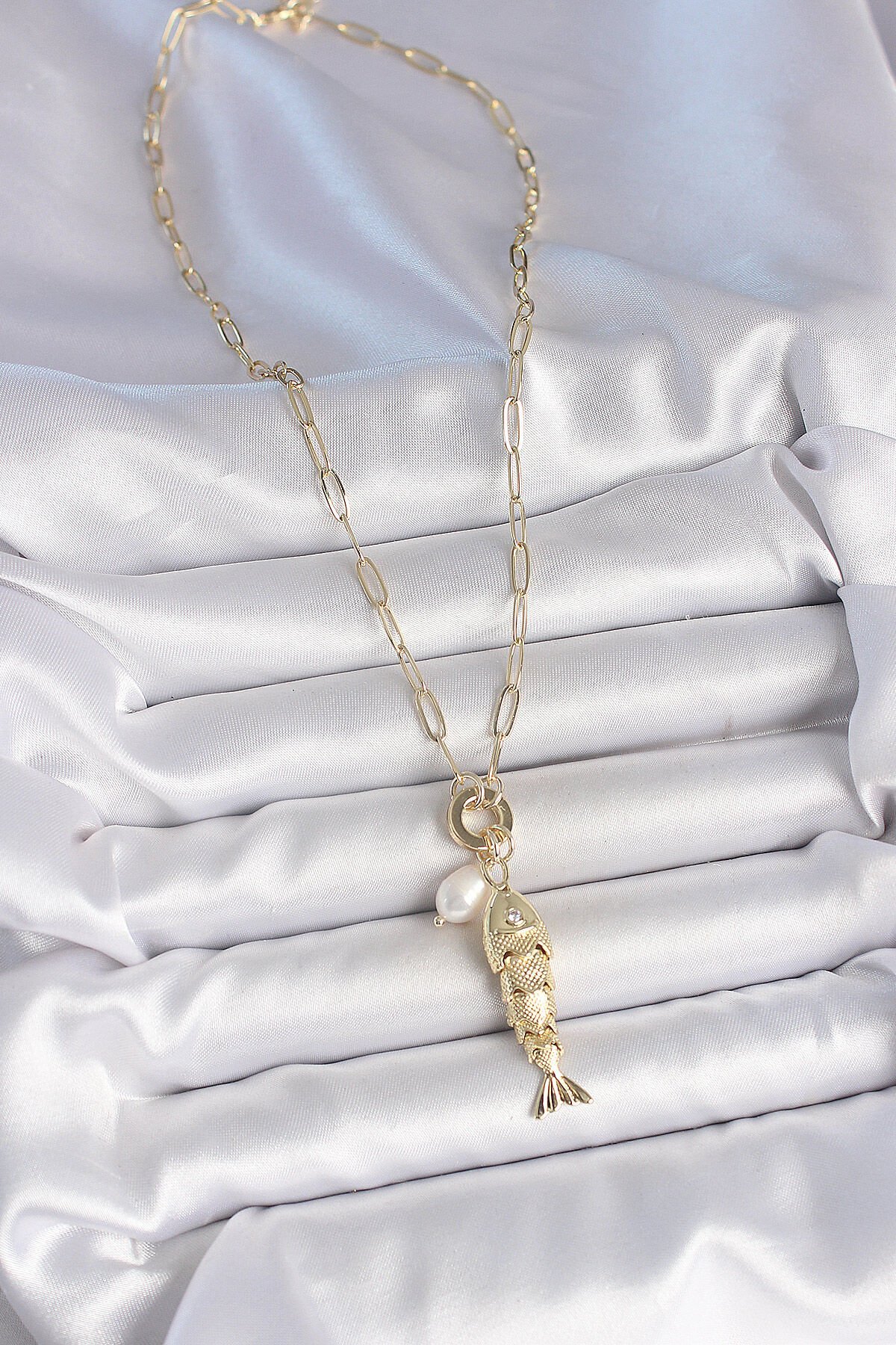 İnci Detaylı Zirkon Taşlı Balık Figürlü Gold Renk Pirinç Kolye