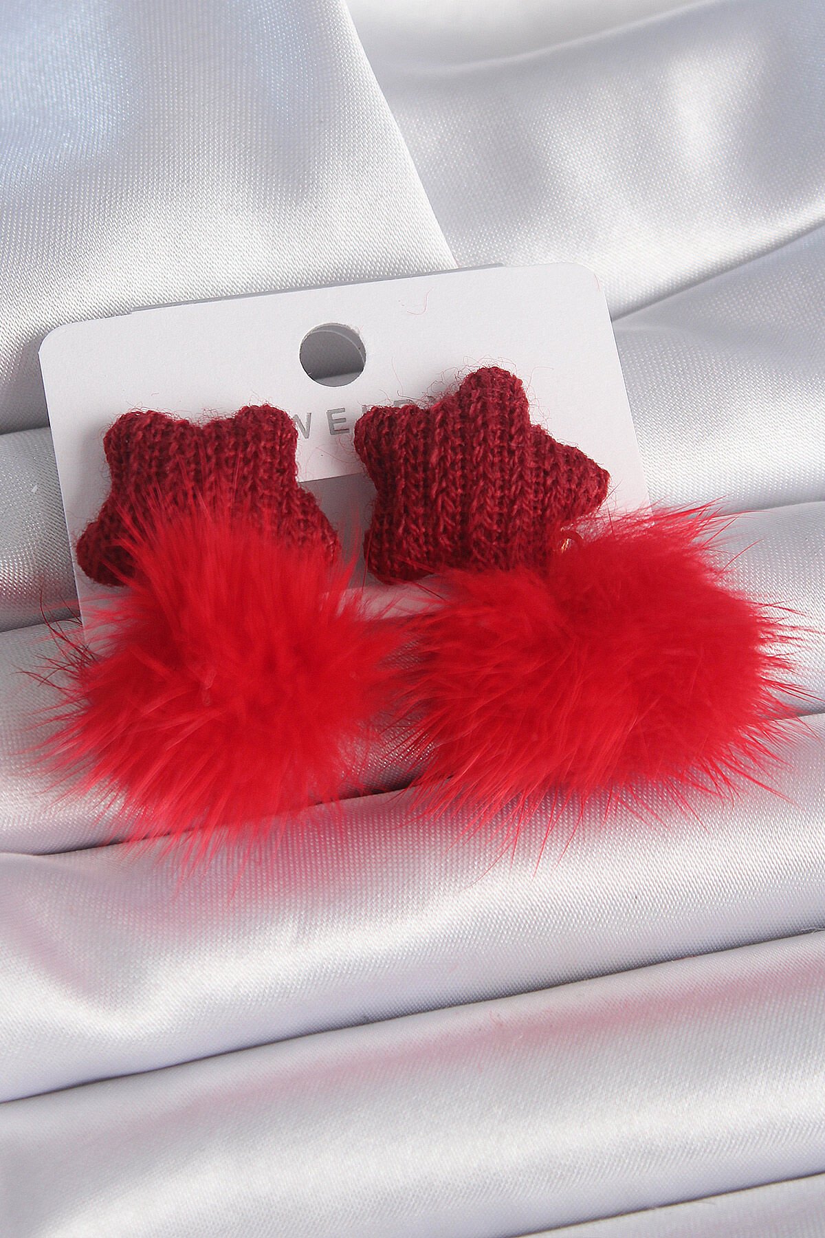 Kırmızı Renk Tüylü Yıldız Ponpon Model Kadın Küpe e_BKP9556