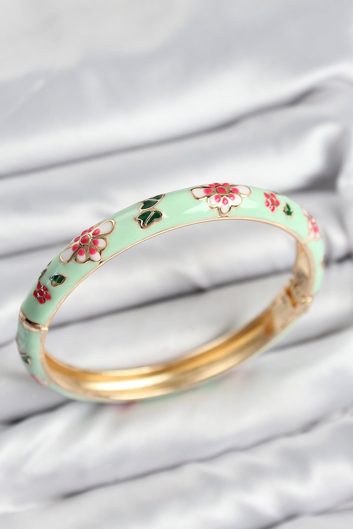 Mineli Pirinç Su Yeşili Çiçek Motifli Gold Kadın Kelepçe e_BB7621