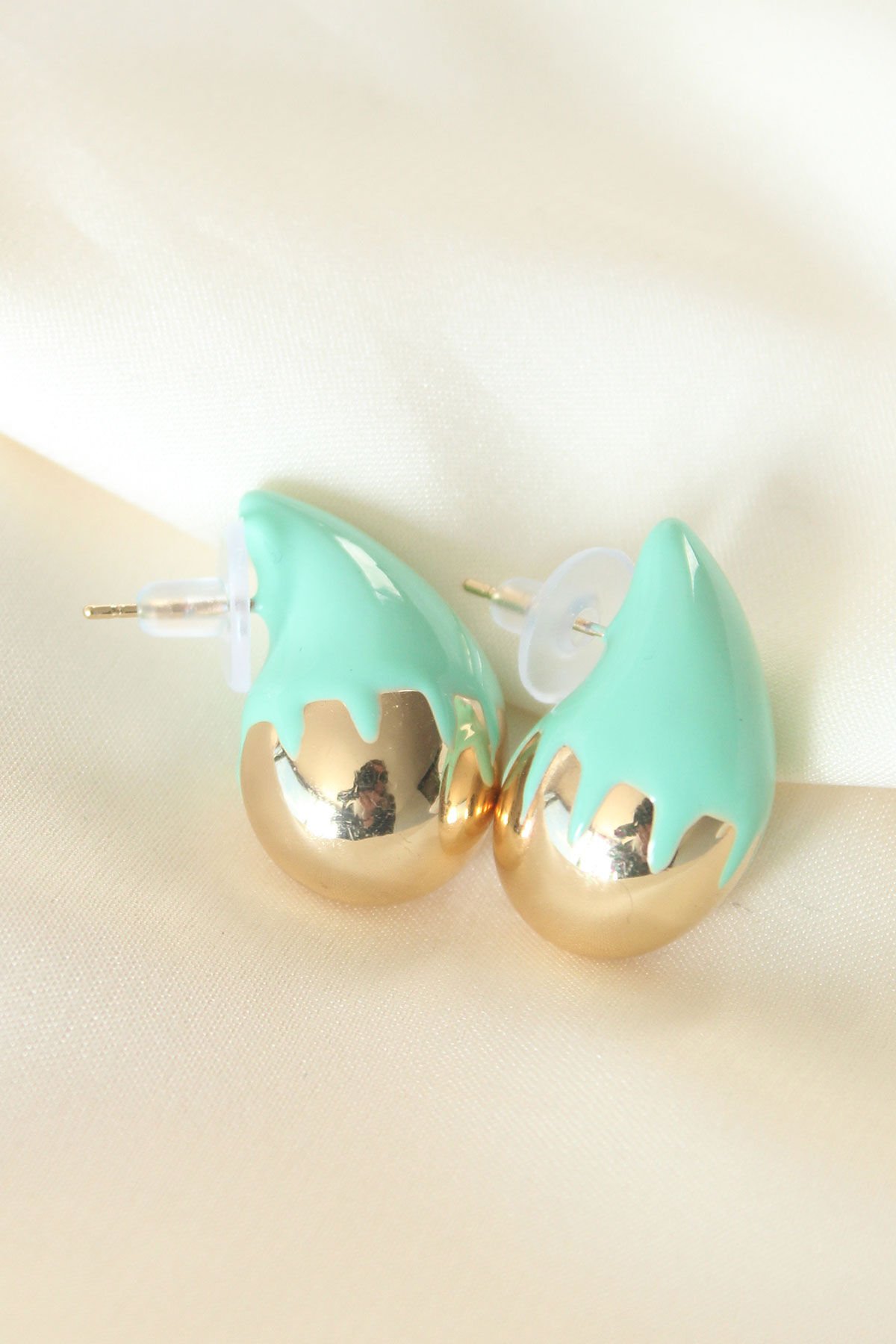 Minimal Turkuaz Mineli Çift Renk Damla Küpe e_BKP8867