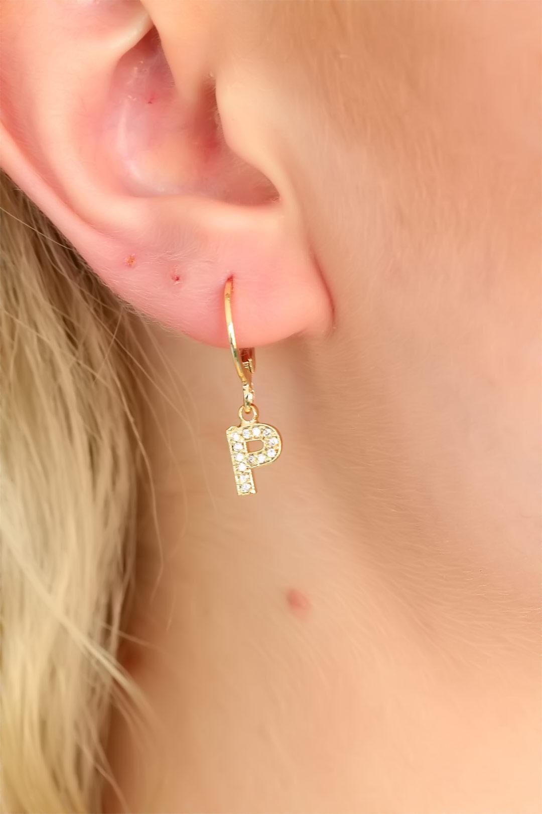 Gold Renk Zirkon Taşlı P Harf Bayan Küpe