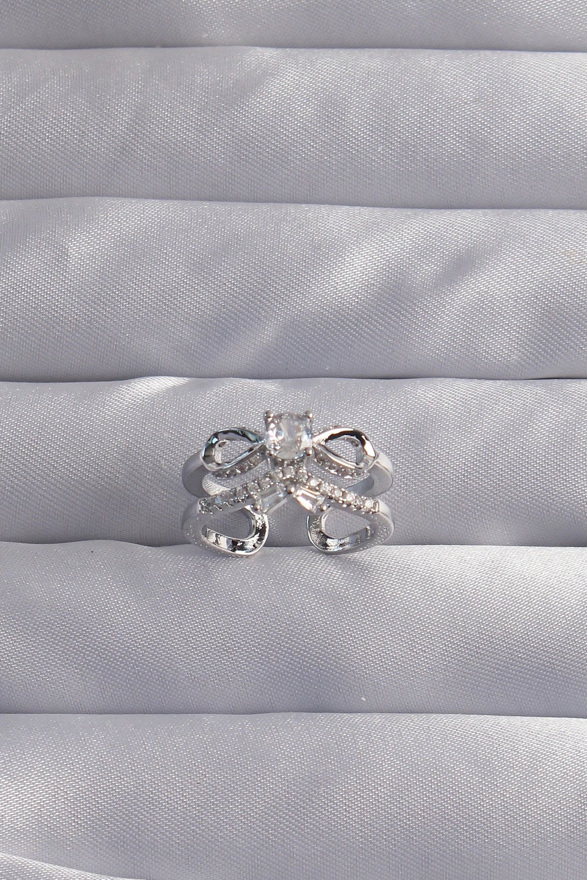 Pirinç Ayarlamalı Gümüş Renk Zirkon Taşlı 2li Görünüm Fiyonk Yüzük