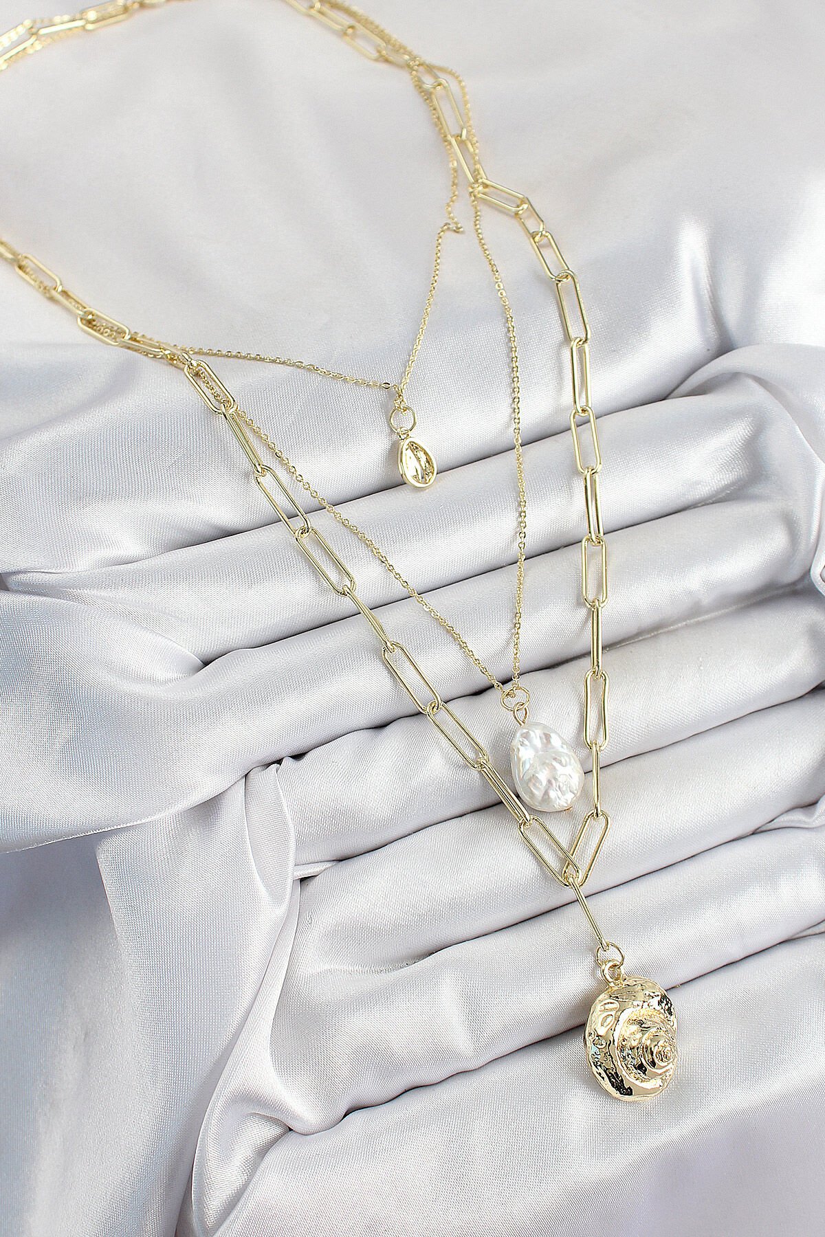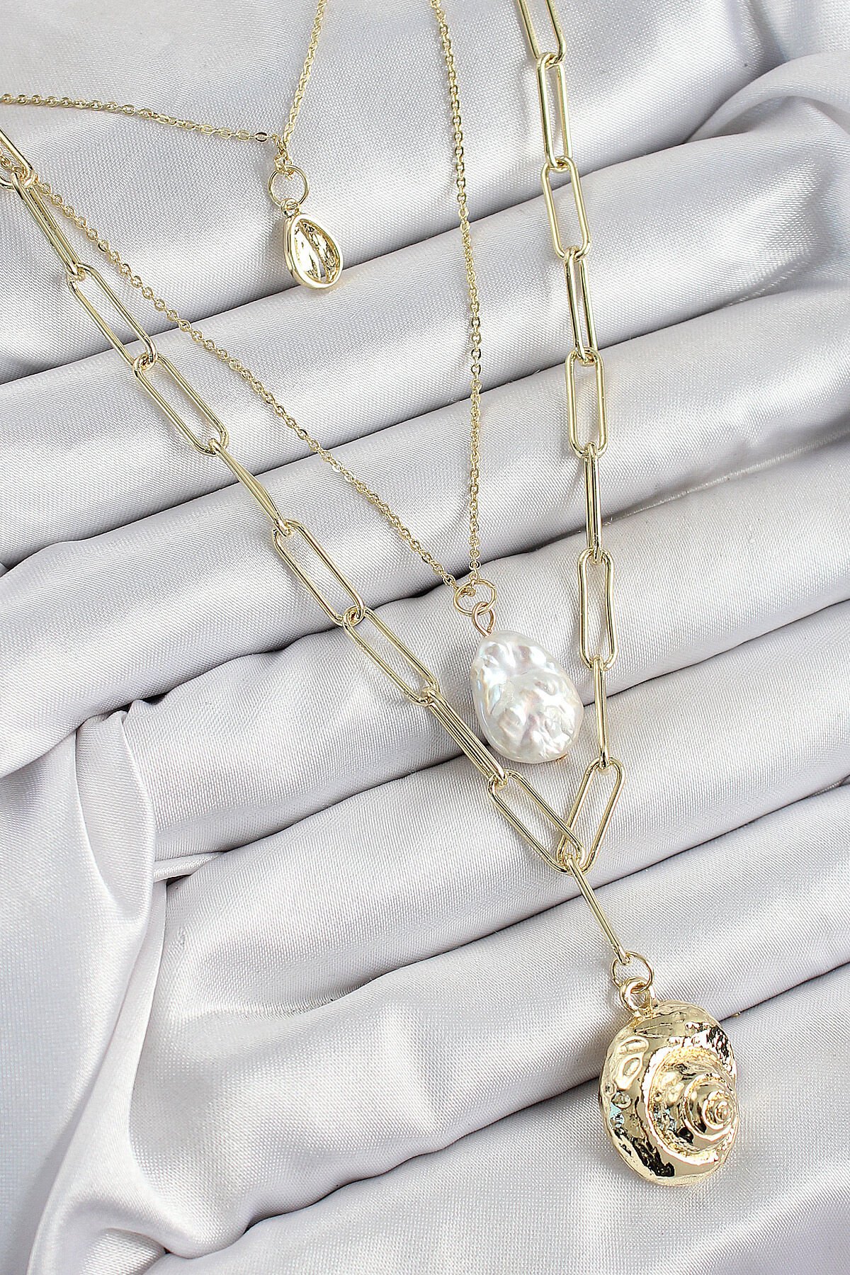Pirinç Çoklu Zincirli İncili Deniz Kabuğu Model Gold Renk Kadın Kolye