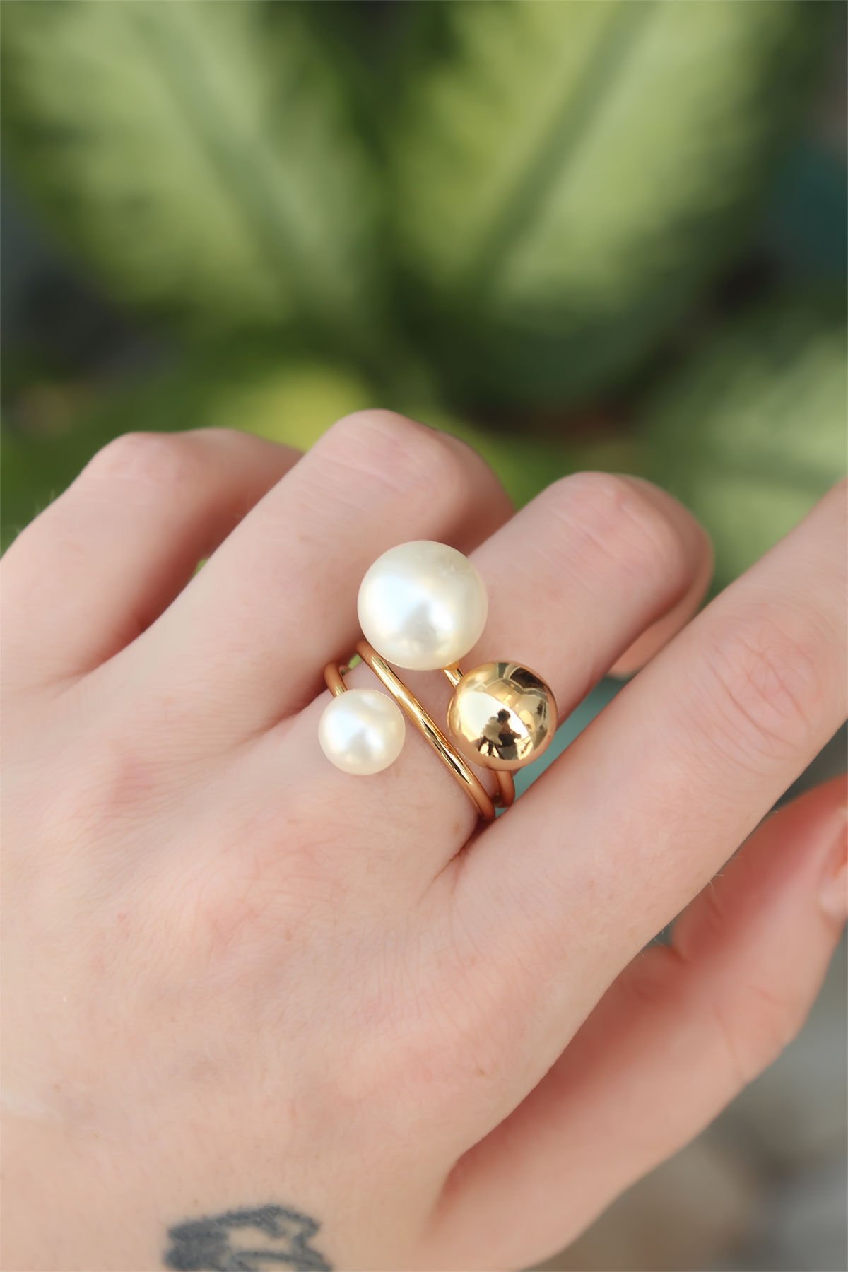 Pirinç Gold Renk Ayarlanabilir İnci Taşlı Yüzük