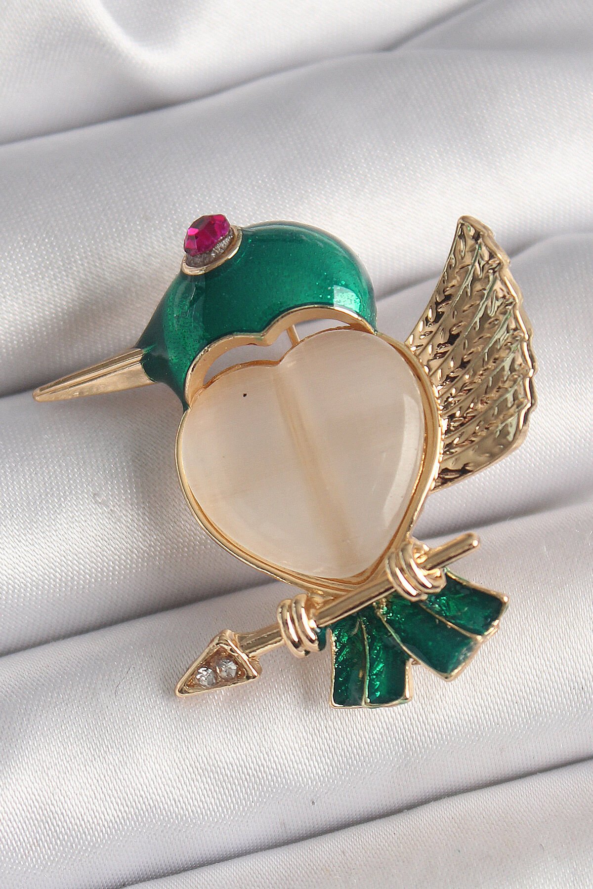 Pirinç Gold Renk Beyaz Mineli Kalp Yeşil Sinek Kuşu Model Pembe Zirkon Taş Detay Kadın Broş