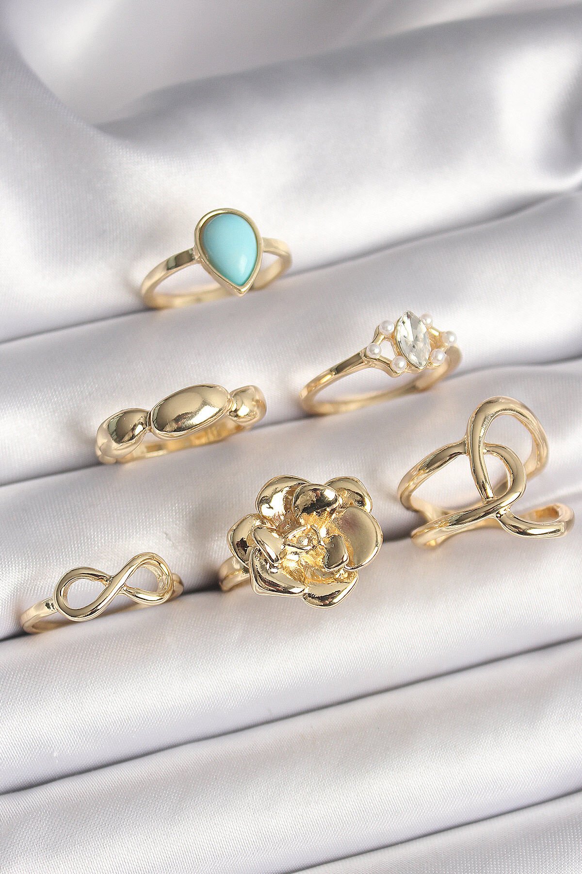 Pirinç Gold Renk Çiçek Model Model Sonsuzluk Zirkon Taş Detaylı 6'Lı Kadın Yüzük Seti