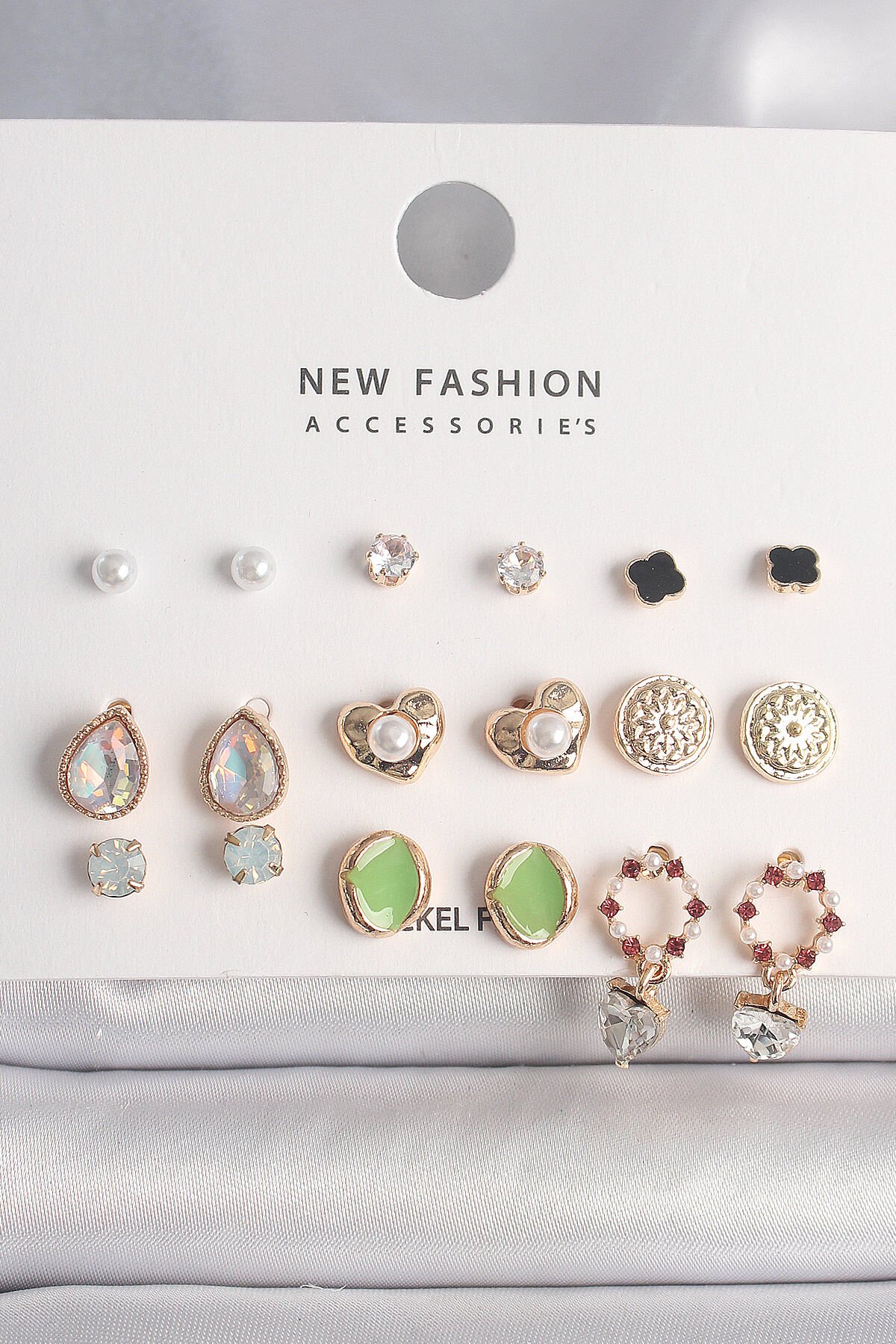 Pirinç Gold Renk Damla Zirkon Taşlı İncili Kalp Detay 9 Çift Kadın Küpe Seti