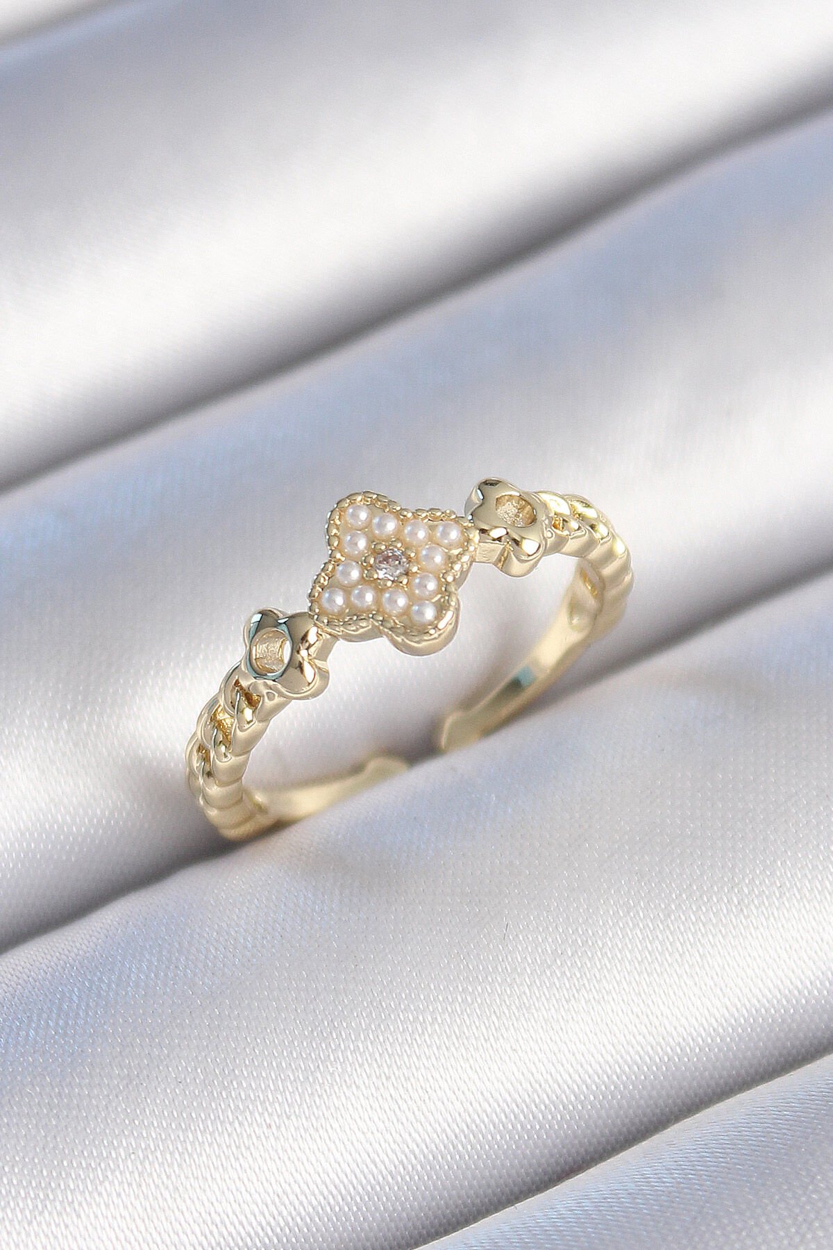 Pirinç Gold Renk İncili Yonca Model Zirkon Taş Detay Kadın Yüzük