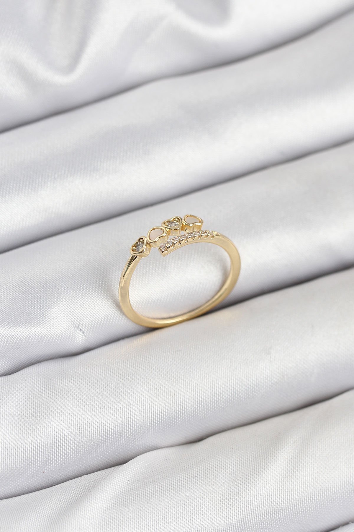 Pirinç Gold Renk Kalpli Detaylı Zirkon Taşlı Kadın Yüzük e_BYK3840