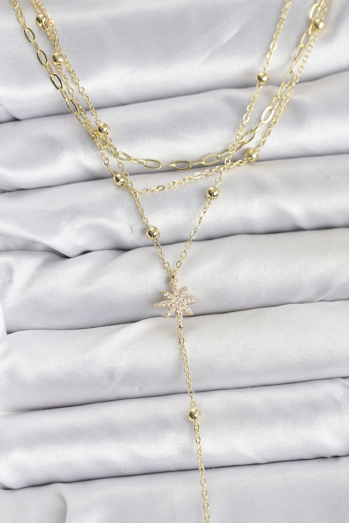 Pirinç Gold Renk Kutup Yıldızı Detaylı 3'lü Kombin Kadın Kolye e_BKO10689