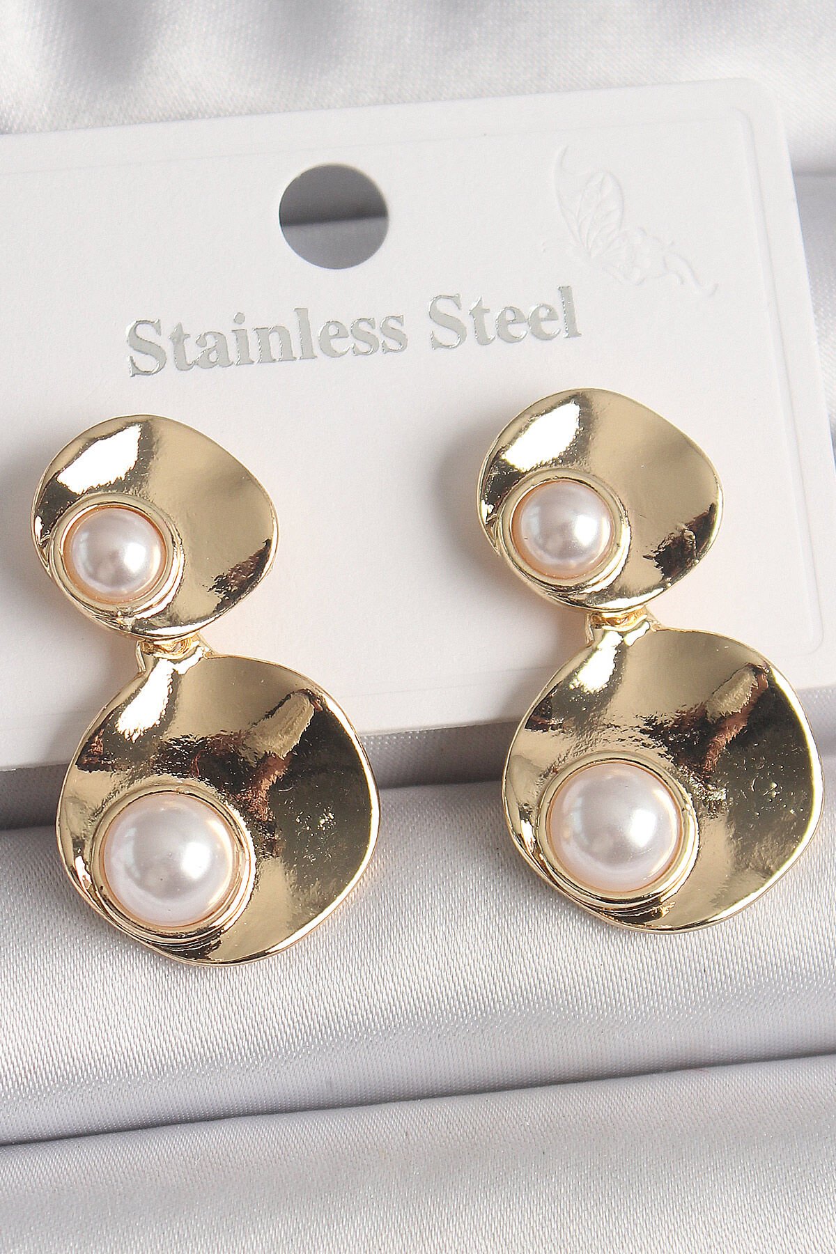 Pirinç Gold Renk Sallantı İnci Detaylı Daire Plaka Model Kadın Küpe