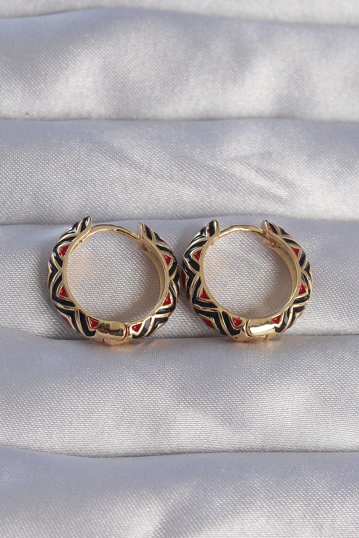 Pirinç Gold Renk Siyah Etnik Desenli Halka Küpe