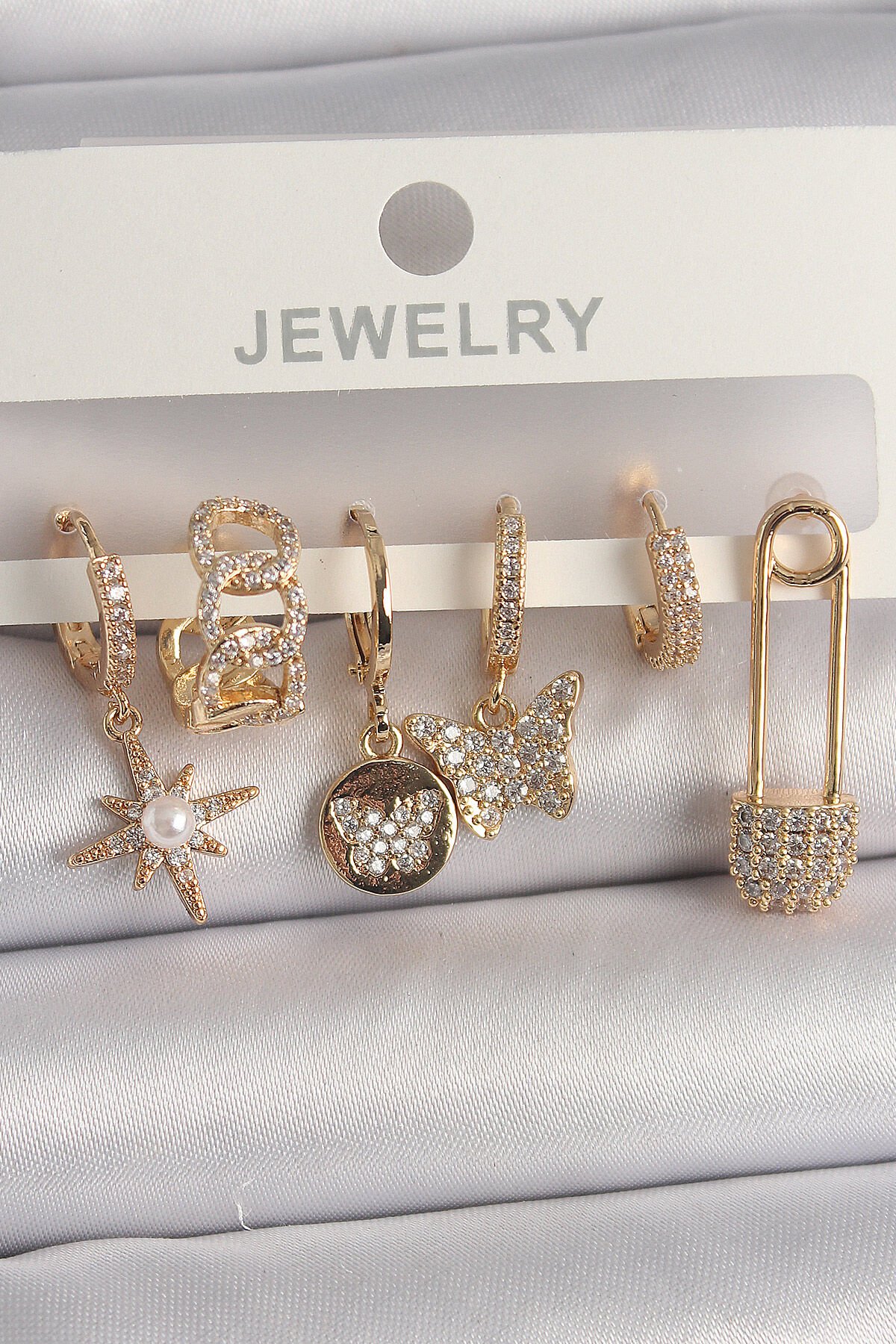 Pirinç Gold Renk Zirkon Sallantı Zirkon Taşlı İnci Detay Kelebek Figür Kadın Küpe Seti