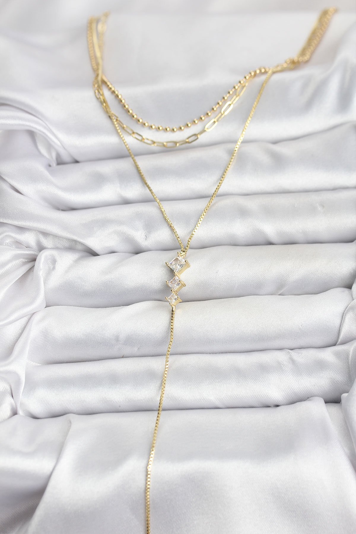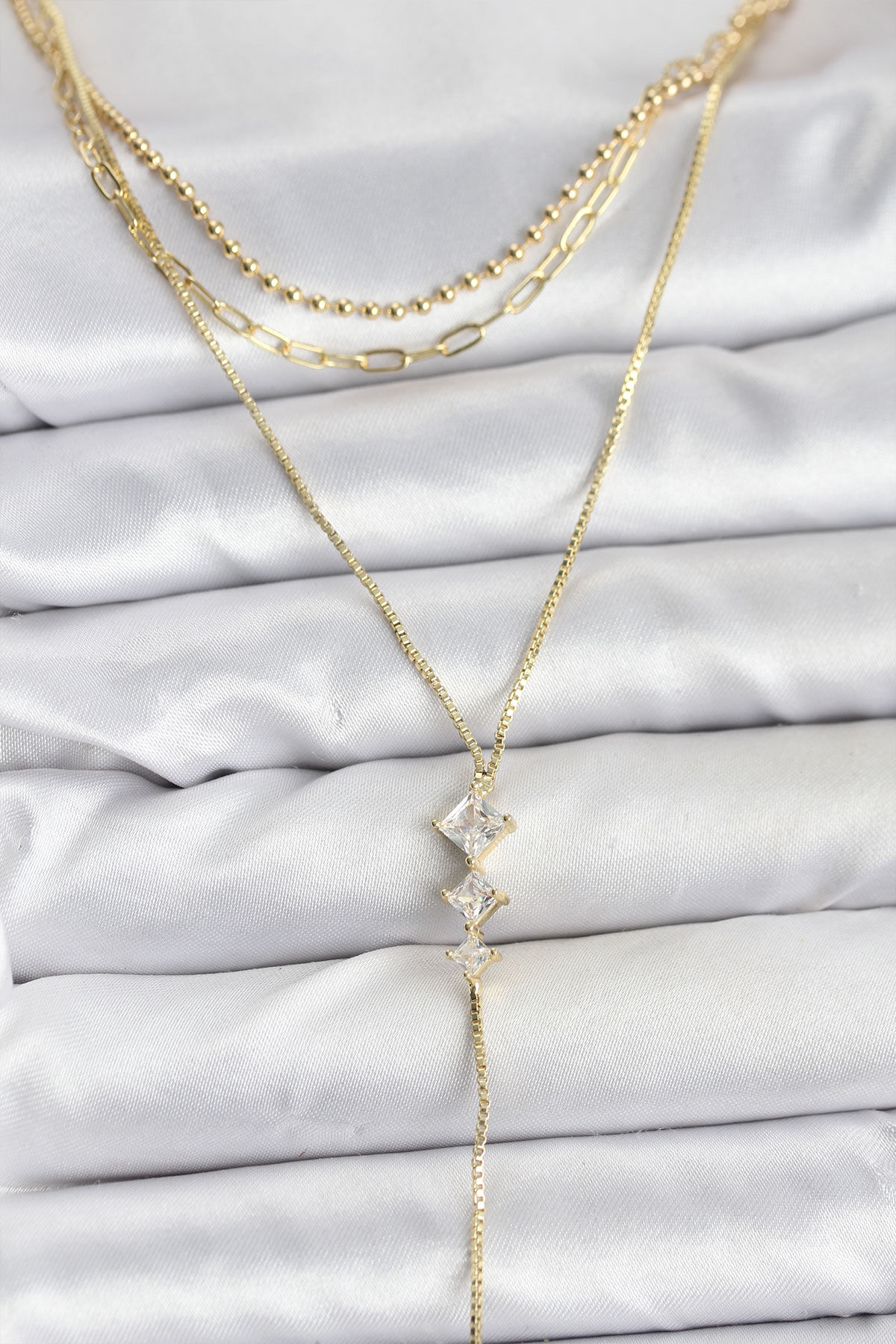 Pirinç Gold Renk Zirkon Taş Detaylı 3'lü Kombin Y Kadın Kolye e_BKO10691