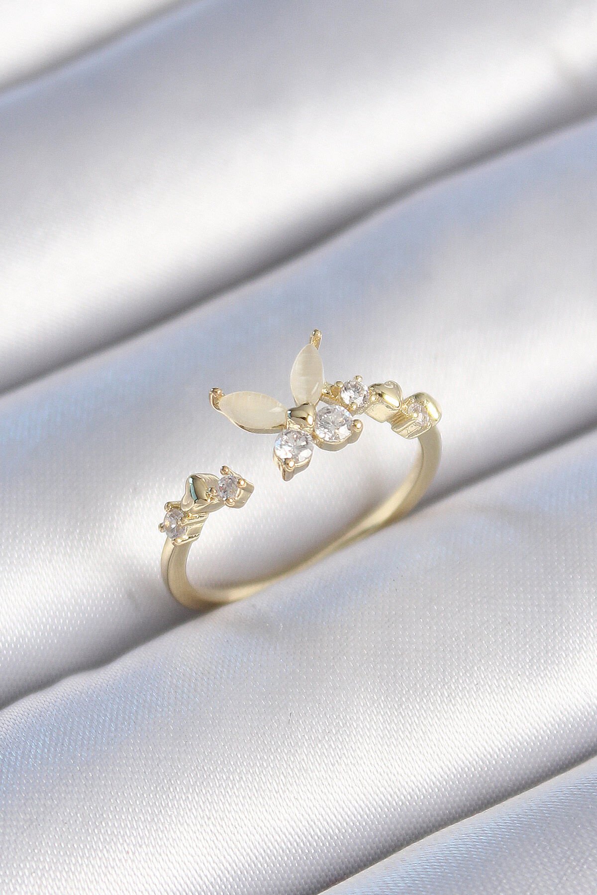 Pirinç Gold Renk Zirkon Taş Detaylı Beyaz Mineli Kelebek Model Kadın Yüzük