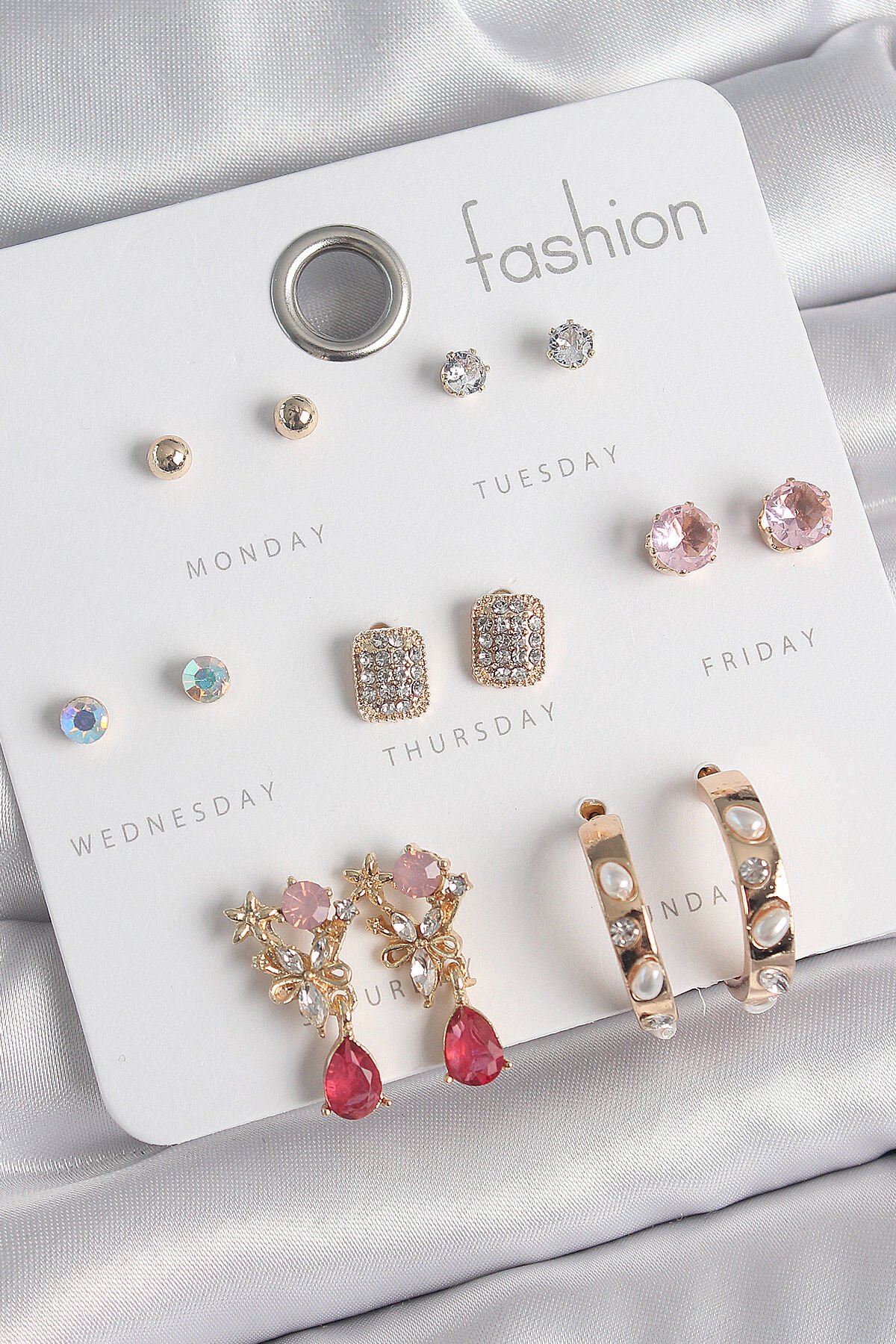 Pirinç Gold Renk Zirkon Taşlı Çiçek Figür İncili Halka Figür 7 Çift Kadın Küpe Seti