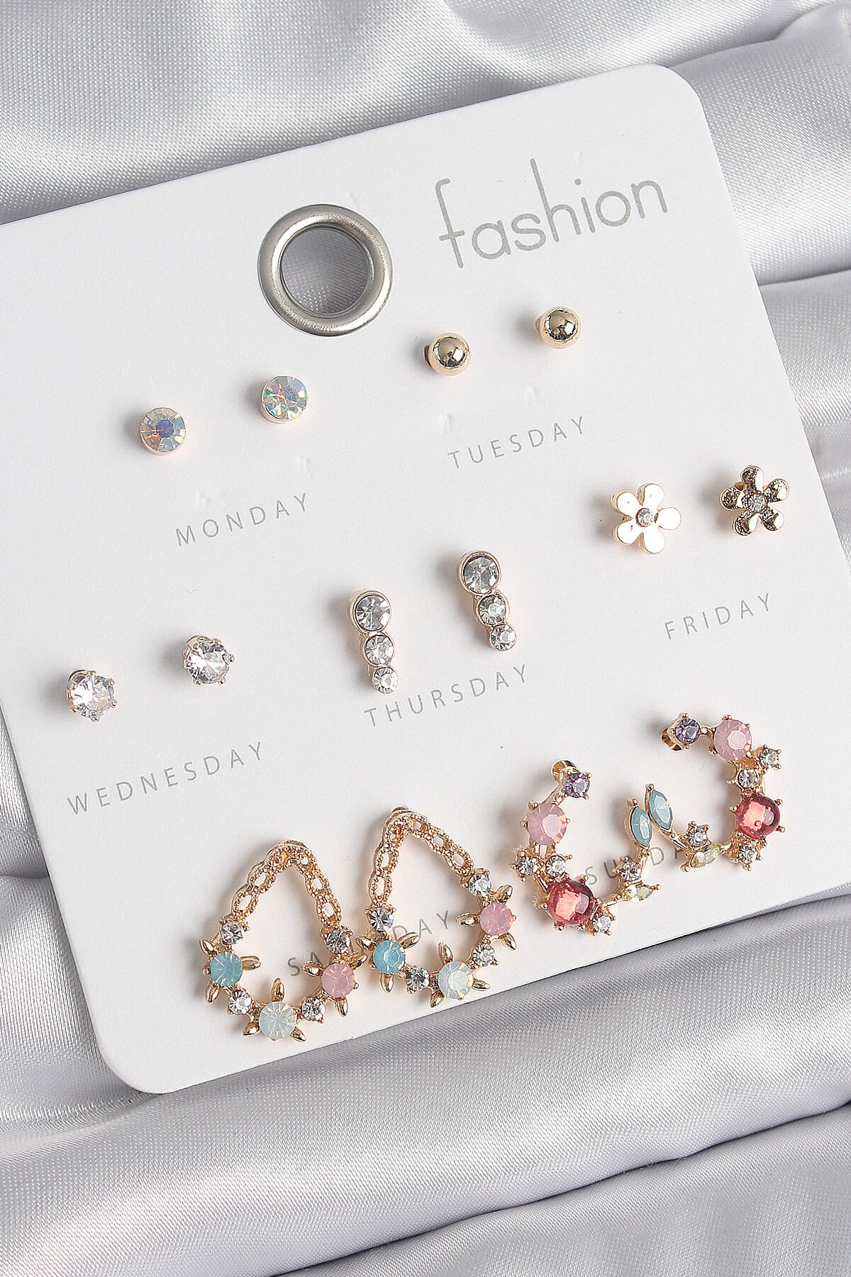 Pirinç Gold Renk Zirkon Taşlı Damla Model Yıldız Detaylı 7 Çift Kadın Küpe Seti