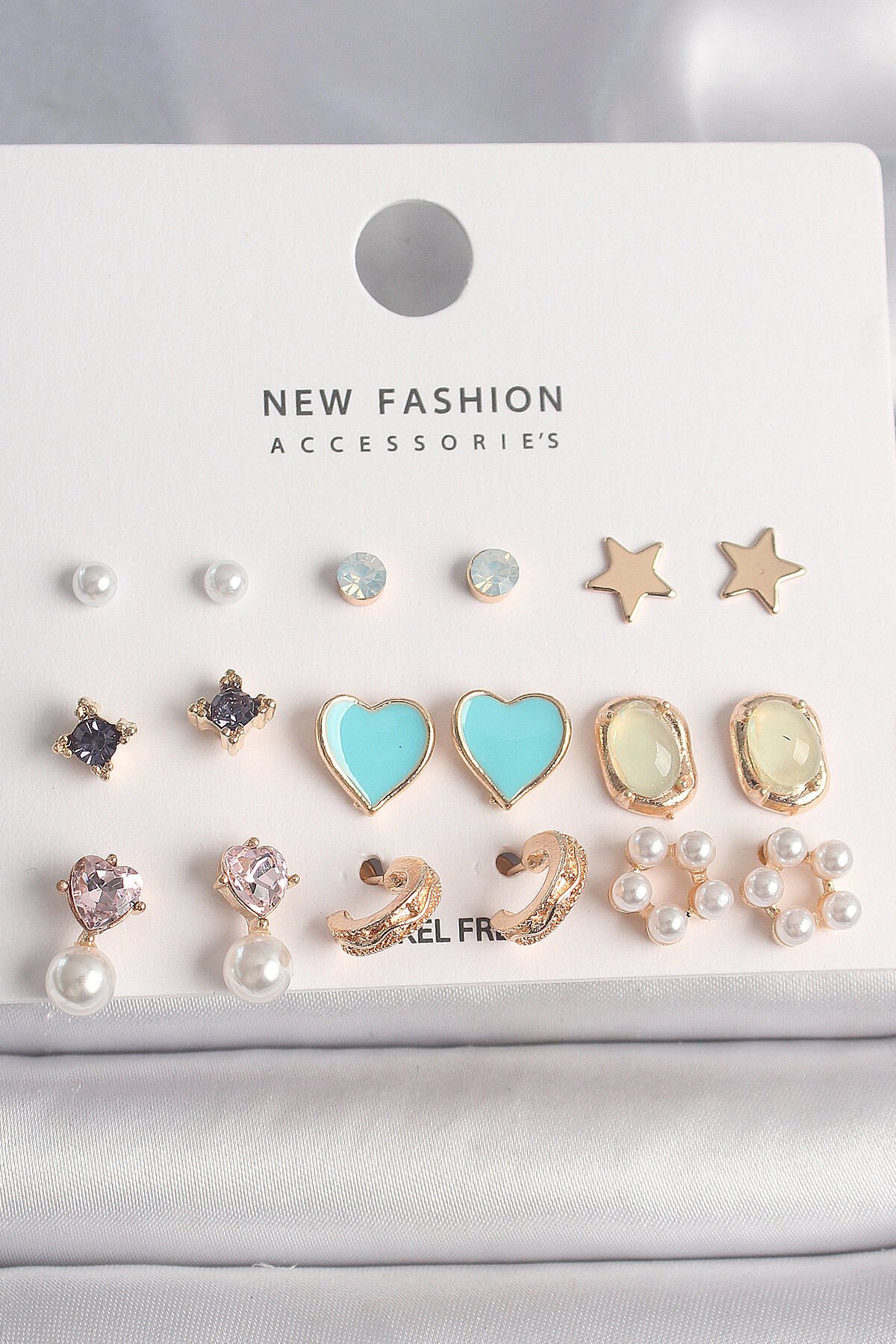Pirinç Gold Renk Zirkon Taşlı İncili Çiçek Mavi Kalp Figür 9 Çift Kadın Küpe Seti