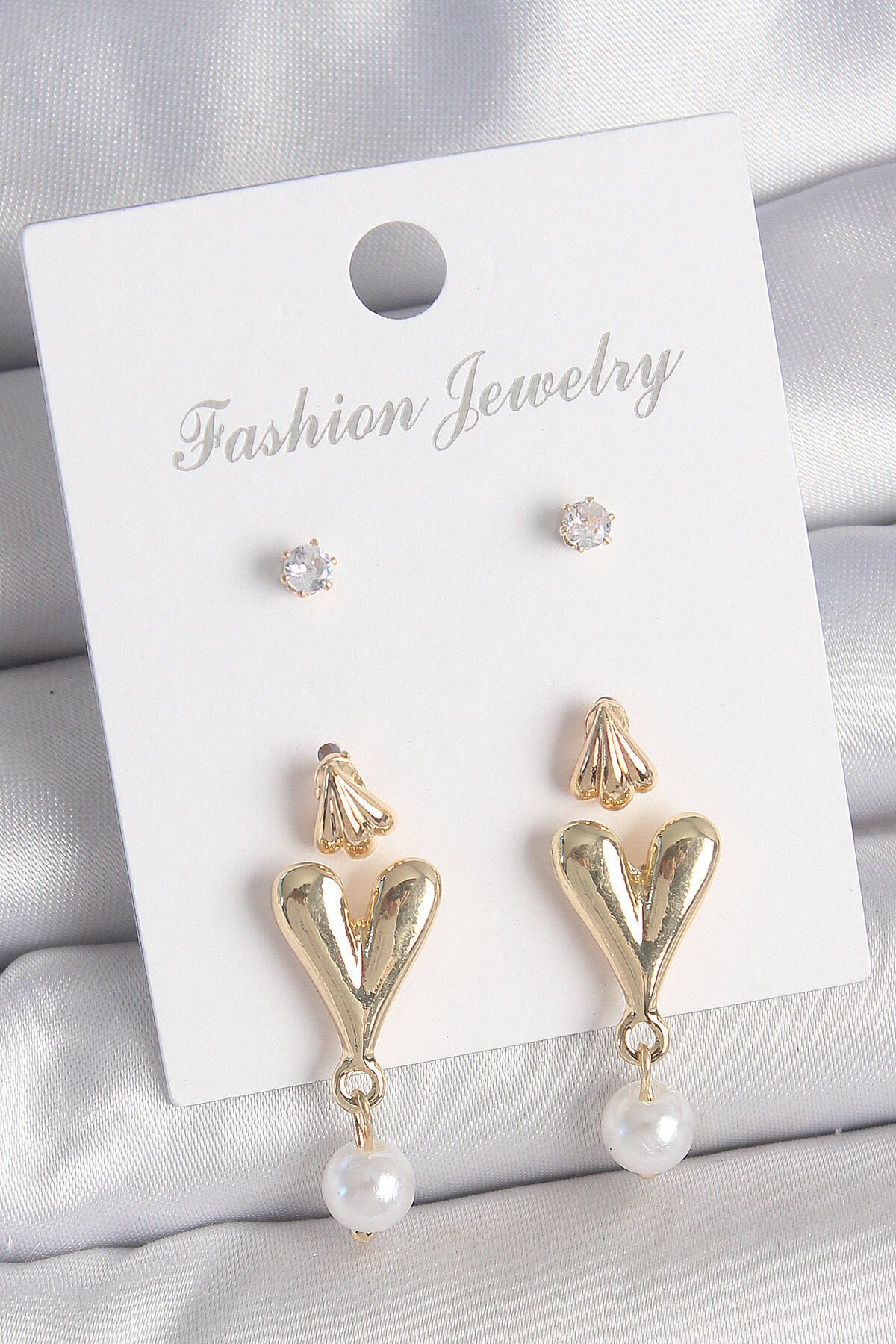 Pirinç Gold Renk Zirkon Taşlı İncili Sallantılı Kalp Model 3 Çift Kadın Küpe Seti