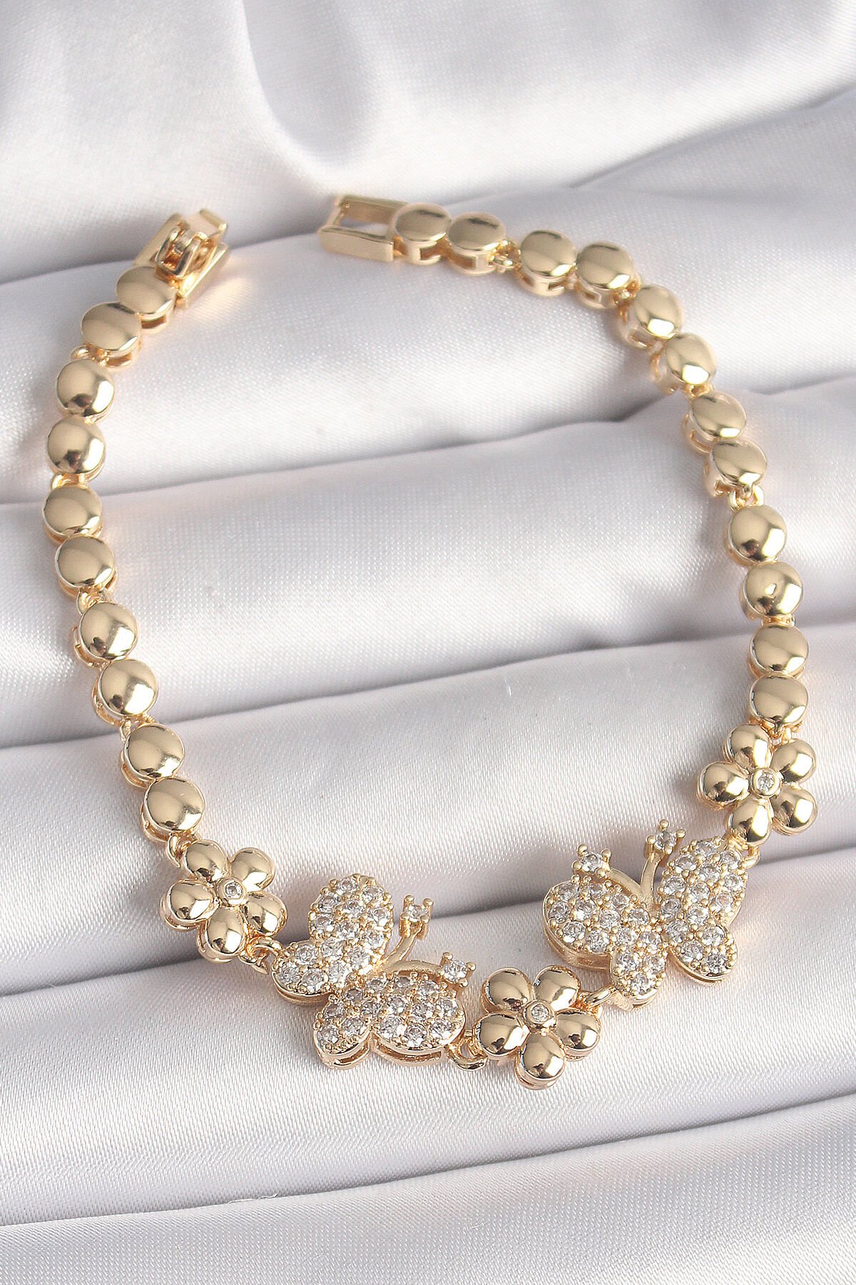 Pirinç Gold Renk Zirkon Taşlı Kelebek Figür Çiçek Zincir Model Kadın Bileklik